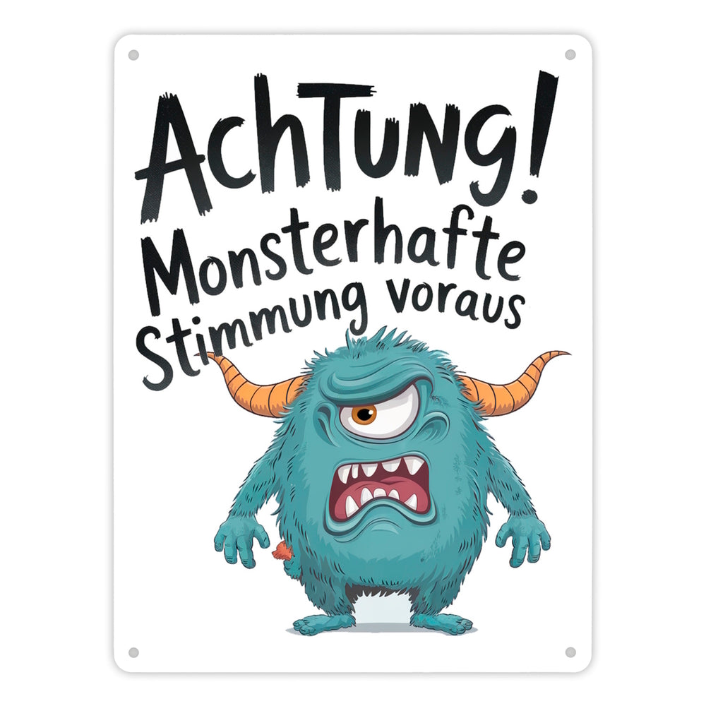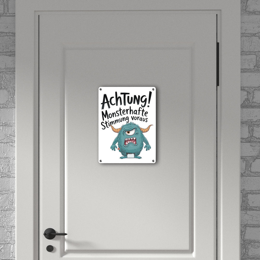 - Das lustige Metallschild zeigt ein fröhliches, blaues Cartoon-Monster mit einem Auge, scharfen Zähnen und niedlichen Hörnern. Es wirkt überrascht oder verärgert und steht auf einem schlichten weißen Hintergrund. Der große, schwarze Text "Achtung! Monsterhafte Stimmung voraus." zieht alle Blicke auf sich.