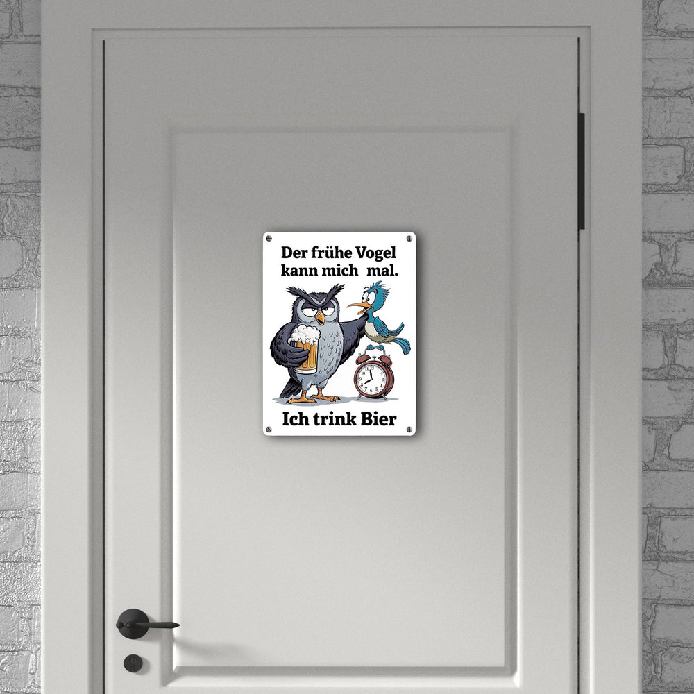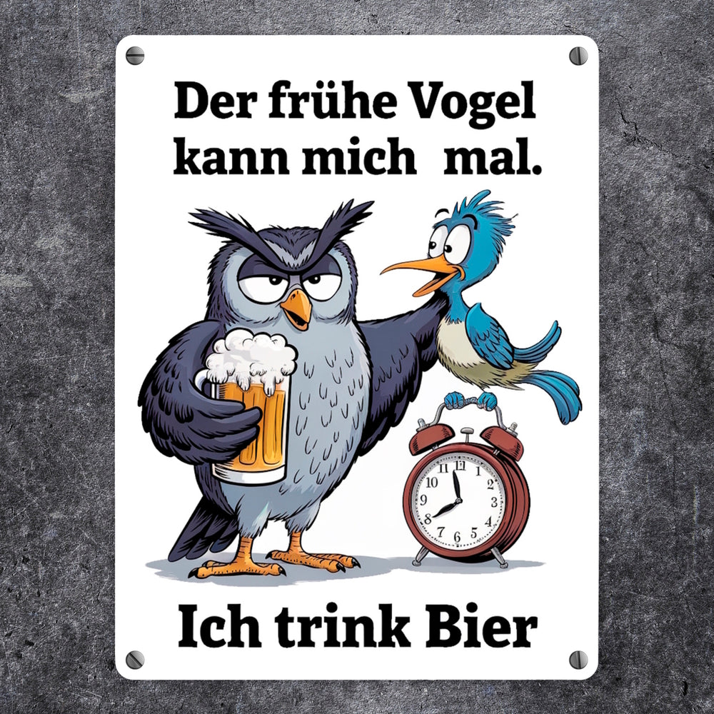 Der frühe Vogel kann mich mal Metallschild in 15x20 cm Eule trinkt Bier