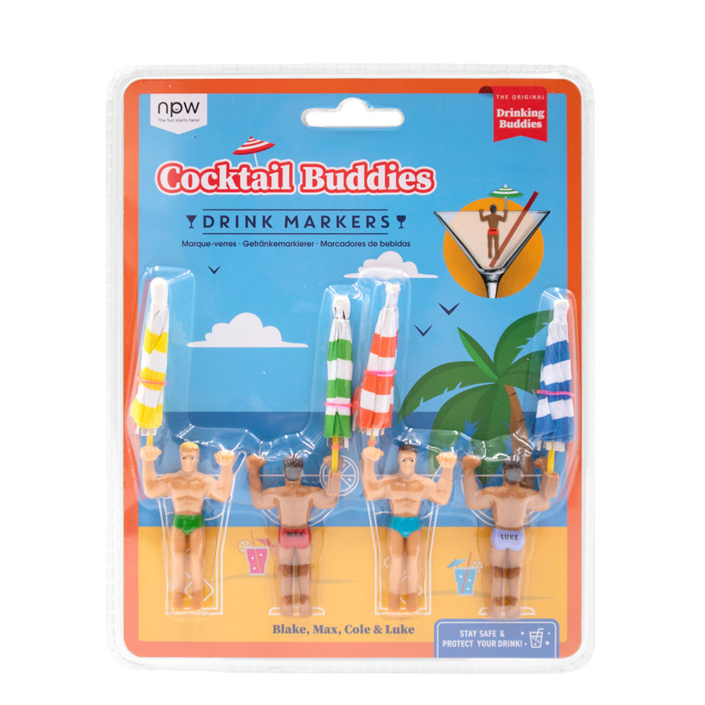 - Jeder der Cocktail Buddies trägt einen Cocktailschirm in der Hand.