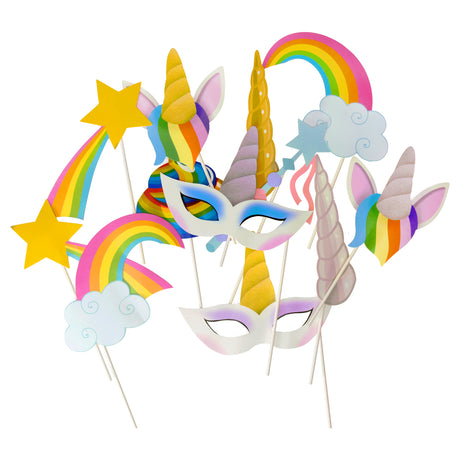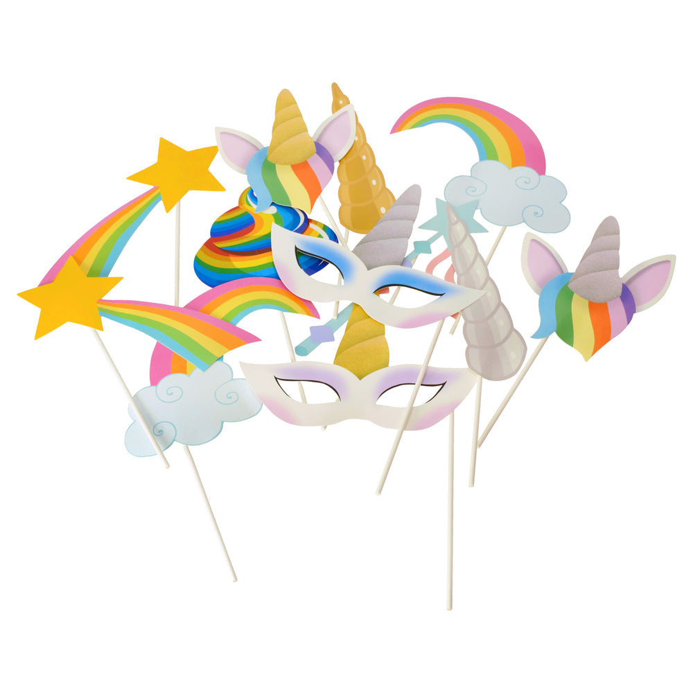 - Lieferumfang: 1x 12er Set Einhorn und Co. Photo Booth. Bestehend aus 1x Regenbogenkackhaufen, 1x Stern, 2x Horn, 2x Maske, 2x Einhorn, 2x Wolke mit Regenbogen und 2x Stern mit Regenbogen.