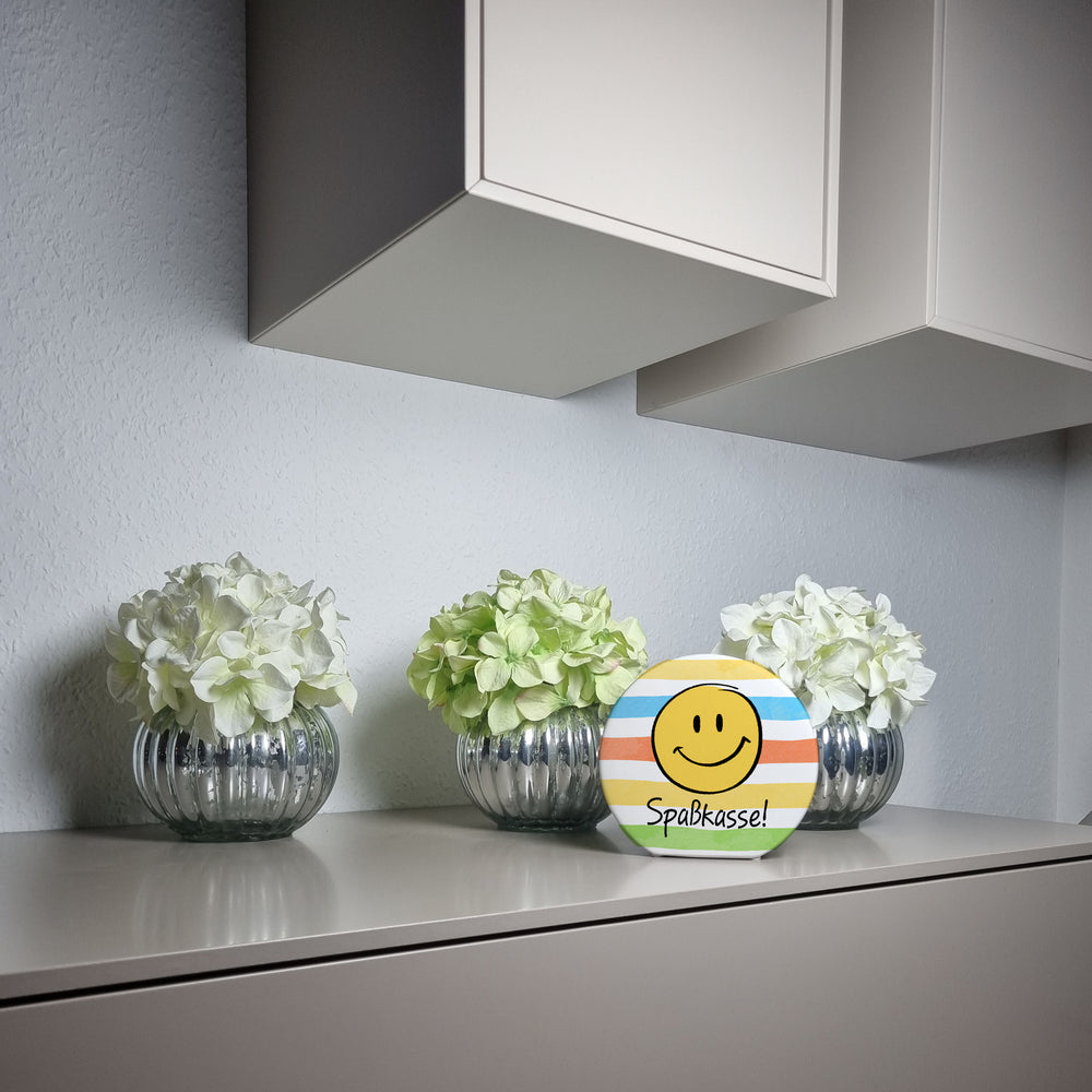 Suchst du ein Geschenk, das sowohl praktisch als auch urkomisch ist? Die Emoticon Spardose mit Spruch Spaßkasse hat genau das, was du brauchst! Diese einzigartige Spardose ist perfekt für jeden, der ein bisschen Freude in seinen Alltag bringen möchte. Mit einem lustigen, breit grinsenden Emoticon und bunten Streifen im Hintergrund ist diese Spardose wahrhaftig ein Hingucker. Ob für Freunde oder Familie – dieses Produkt zaubert jedem ein Lächeln ins Gesicht.Die Einsatzmöglichkeiten dieser fröhlichen Spardose sind unbegrenzt! Du kannst sie nutzen, um für deinen nächsten Sommerurlaub zu sparen, eine kreative Familienzeit zu planen oder einfach nur für den täglichen Kaffee. Besonders gut eignet sich die Spaßkasse als Motivationshilfe, um kleine oder große Sparziele zu erreichen. Und hey, warum nicht ein bisschen Spaß haben, während man seine Münzen in die Kasse wirft? Ob auf deinem Schreibtisch, im Kinderzimmer oder im Wohnzimmer – diese Spardose wird sofort zum Mittelpunkt jedes Raumes.Warum ist die Emoticon Spardose das perfekte Geschenk? Ganz einfach! Sie vereint Humor, Funktionalität und Kreativität in einem bunten Design. Es ist ein tolles Mitbringsel für Geburtstage, Jubiläen oder einfach nur so, um jemandem eine Freude zu machen. Das fröhliche Design und der motivierende Spruch Spaßkasse sorgen dafür, dass dieses Geschenk lange in Erinnerung bleibt und immer wieder ein Lächeln hervorzaubert. Also, worauf wartest du noch? Gönn dir und deinen Liebsten diese wunderbare Spaßkasse!