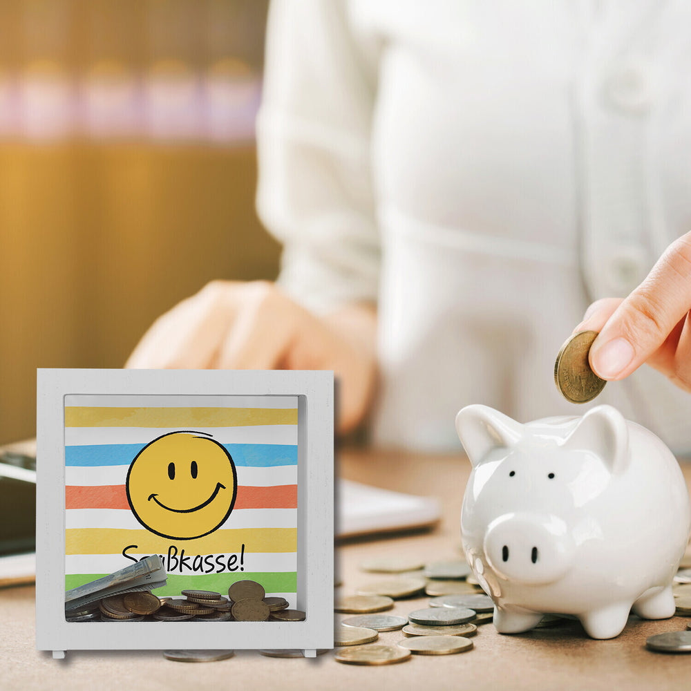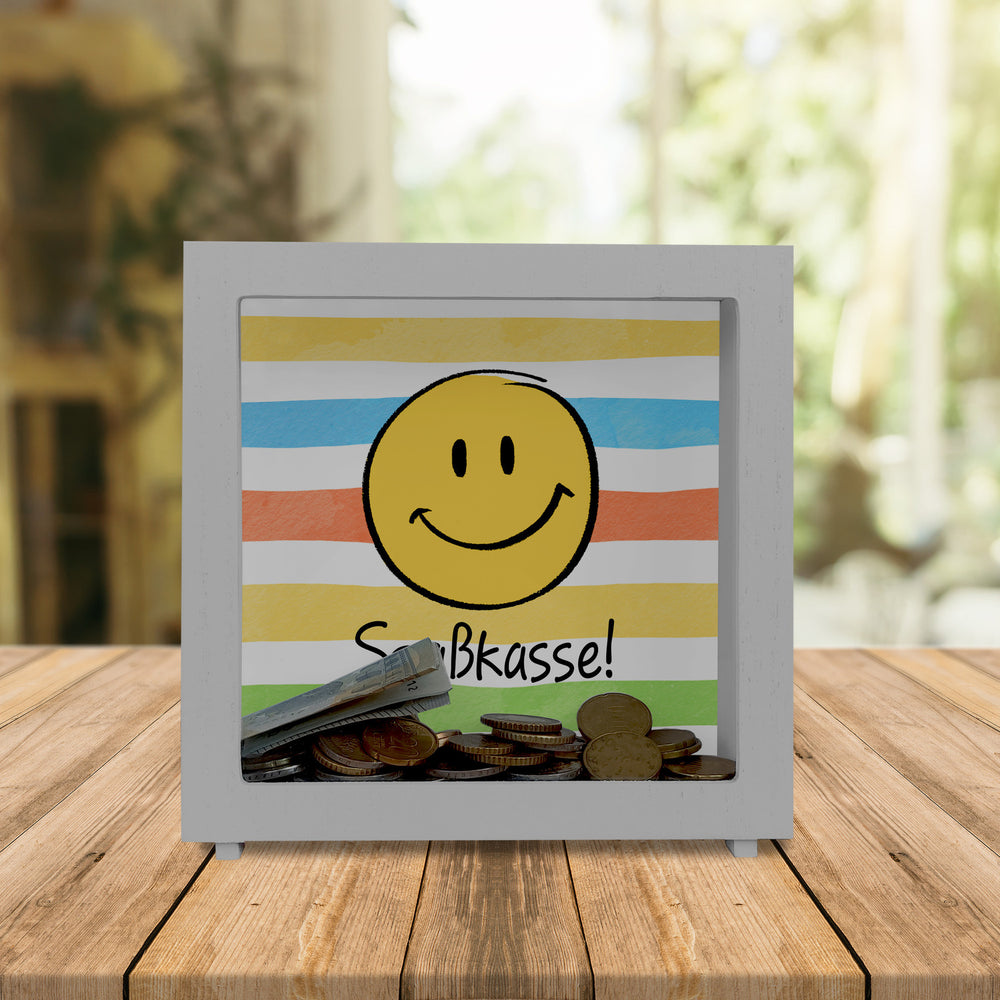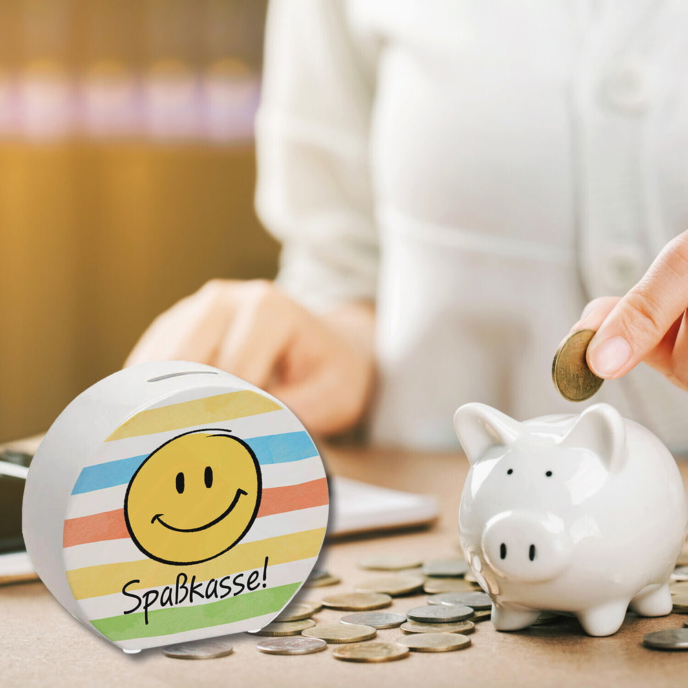• Mit der Emoticon Spardose "Spaßkasse" wird jeder Sparversuch zum Lacher. Diese fröhliche Spardose zeigt ein Emoticon mit einem breiten Grinsen und bunten Streifen im Hintergrund.