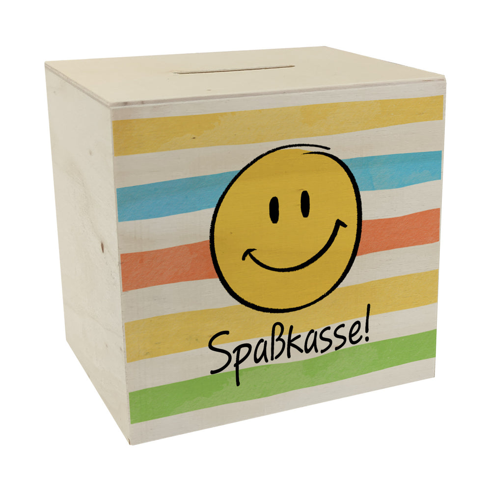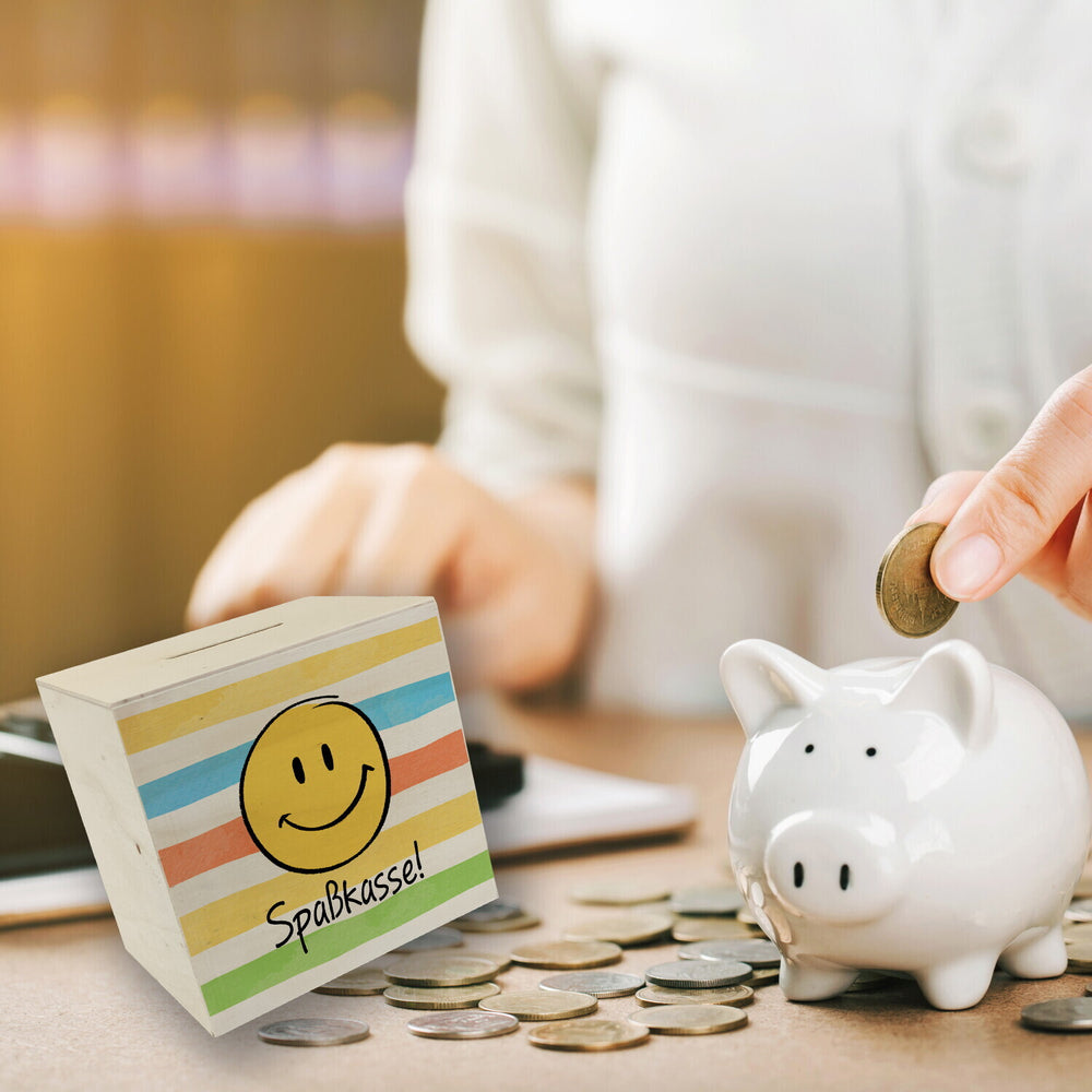 • 1x Emoticon Spardose mit Spruch Spaßkasse in der gewählten Ausführung