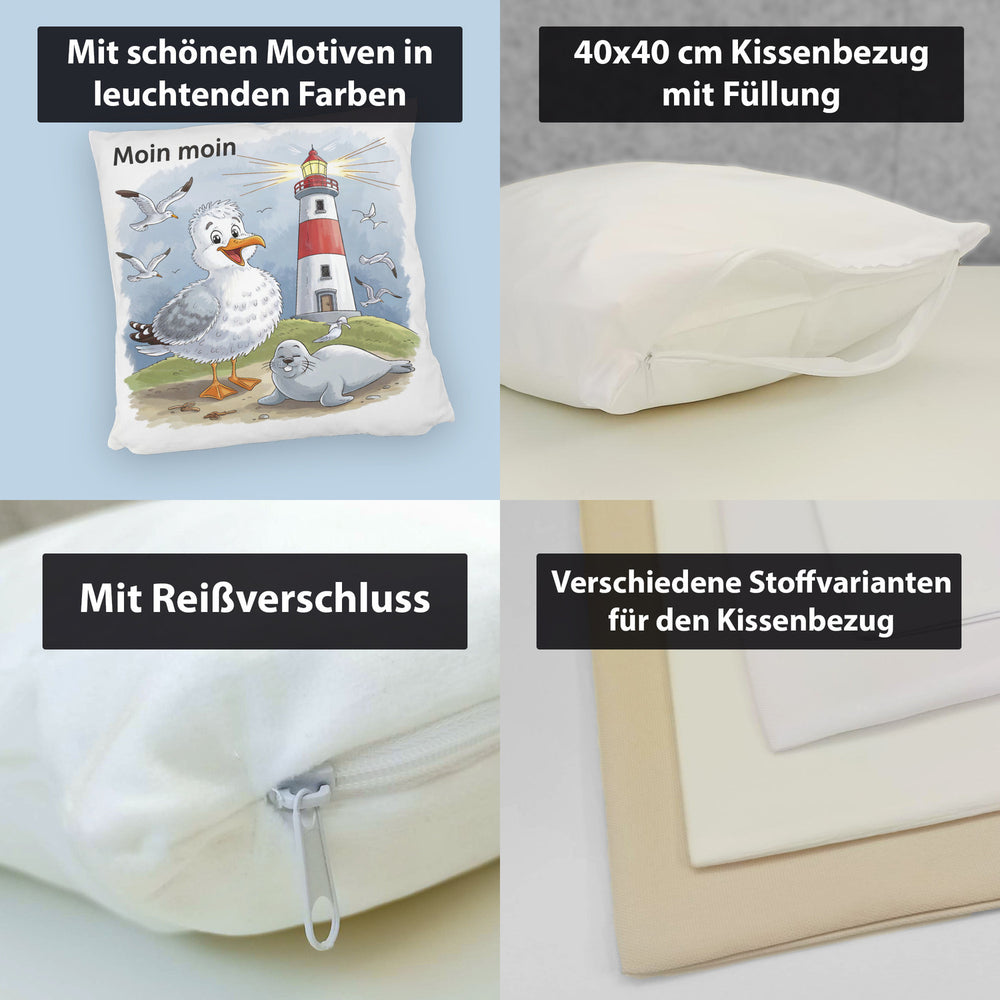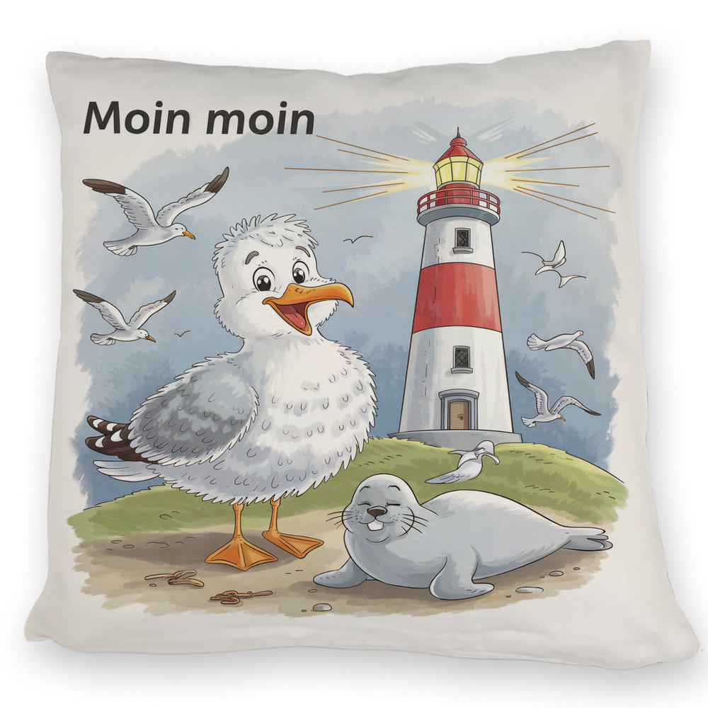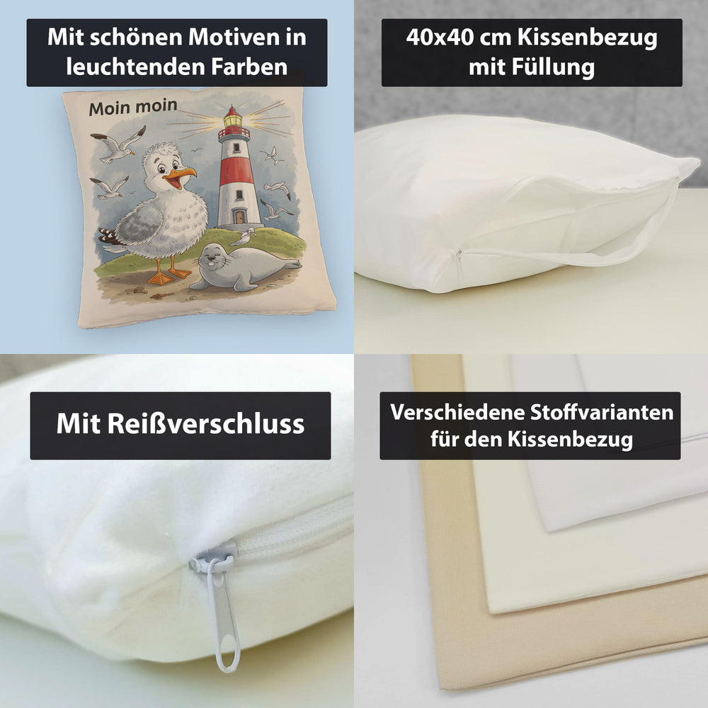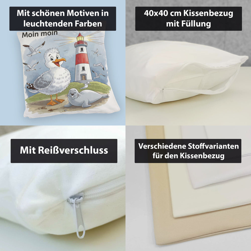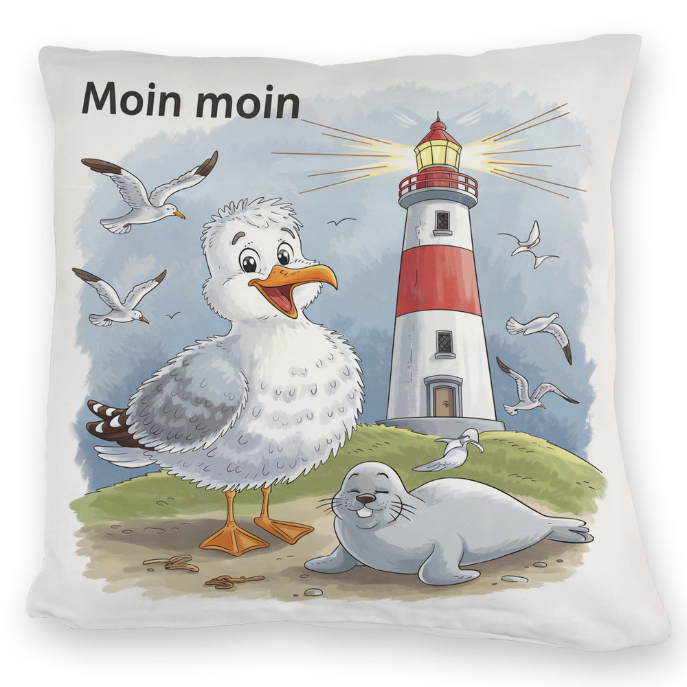 - 1x Fröhliche Möwe und Leuchtturm Kissen - MOIN MOIN in der gewählten Ausführung