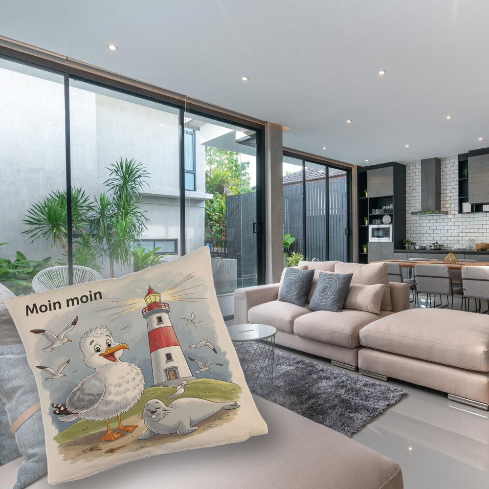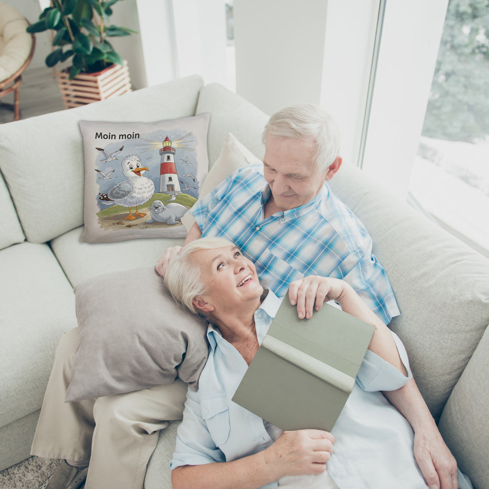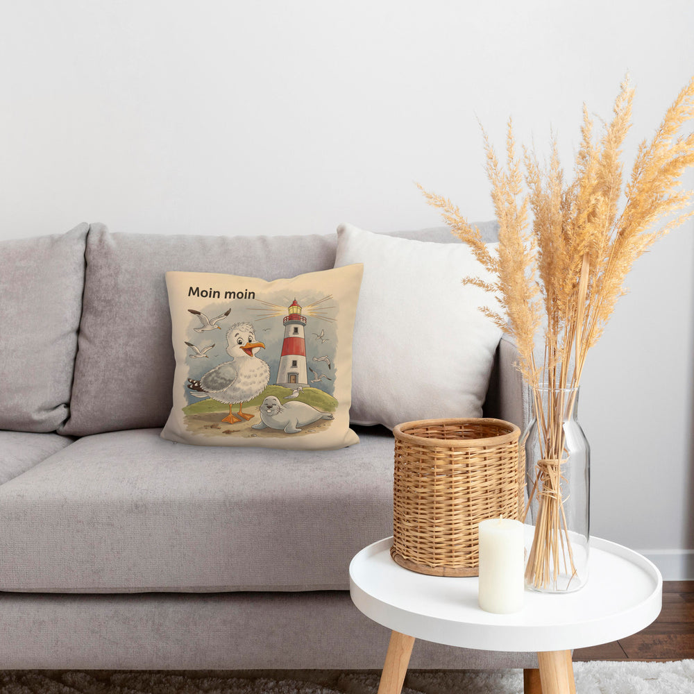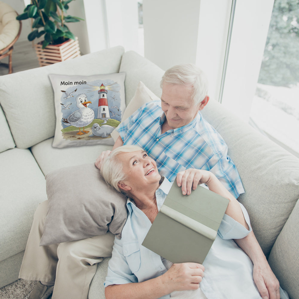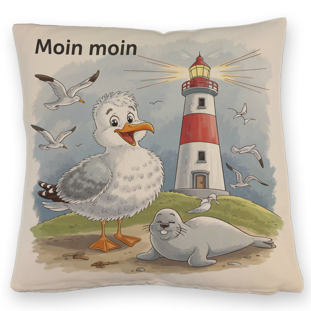 - 1x Fröhliche Möwe und Leuchtturm Kissen - MOIN MOIN in der gewählten Ausführung