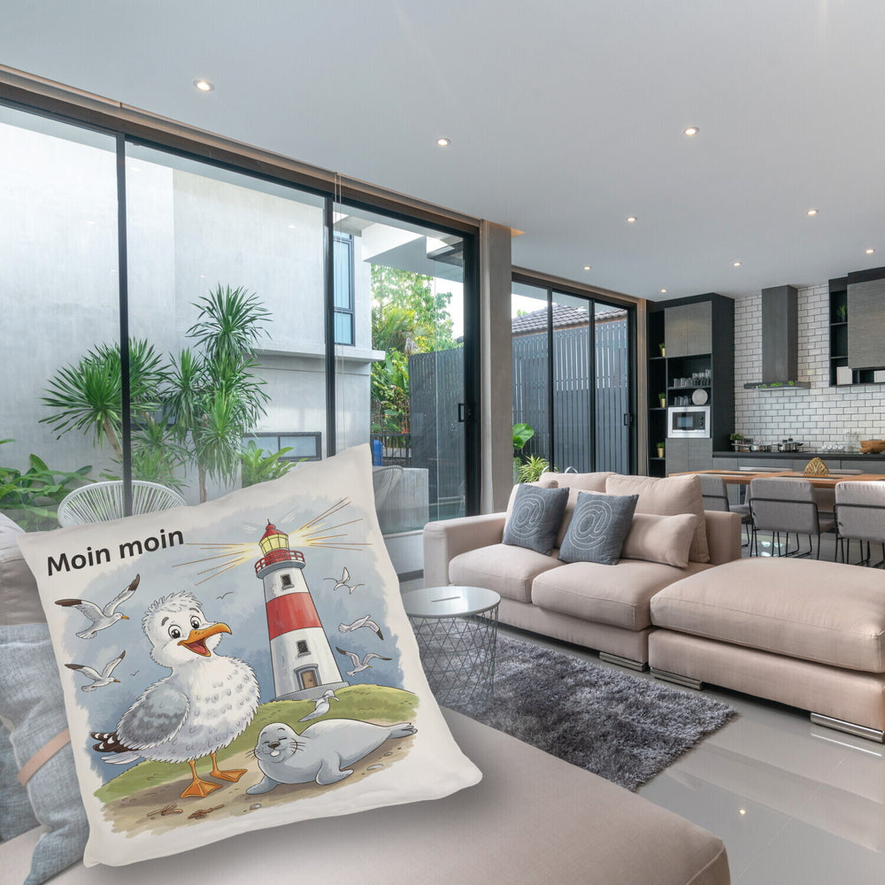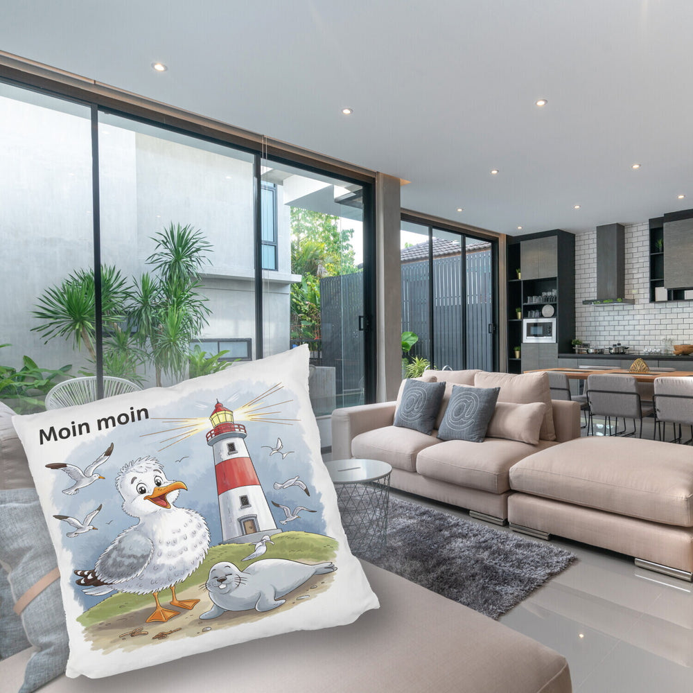 Fröhliche Möwe und Leuchtturm Kissen - MOIN MOIN