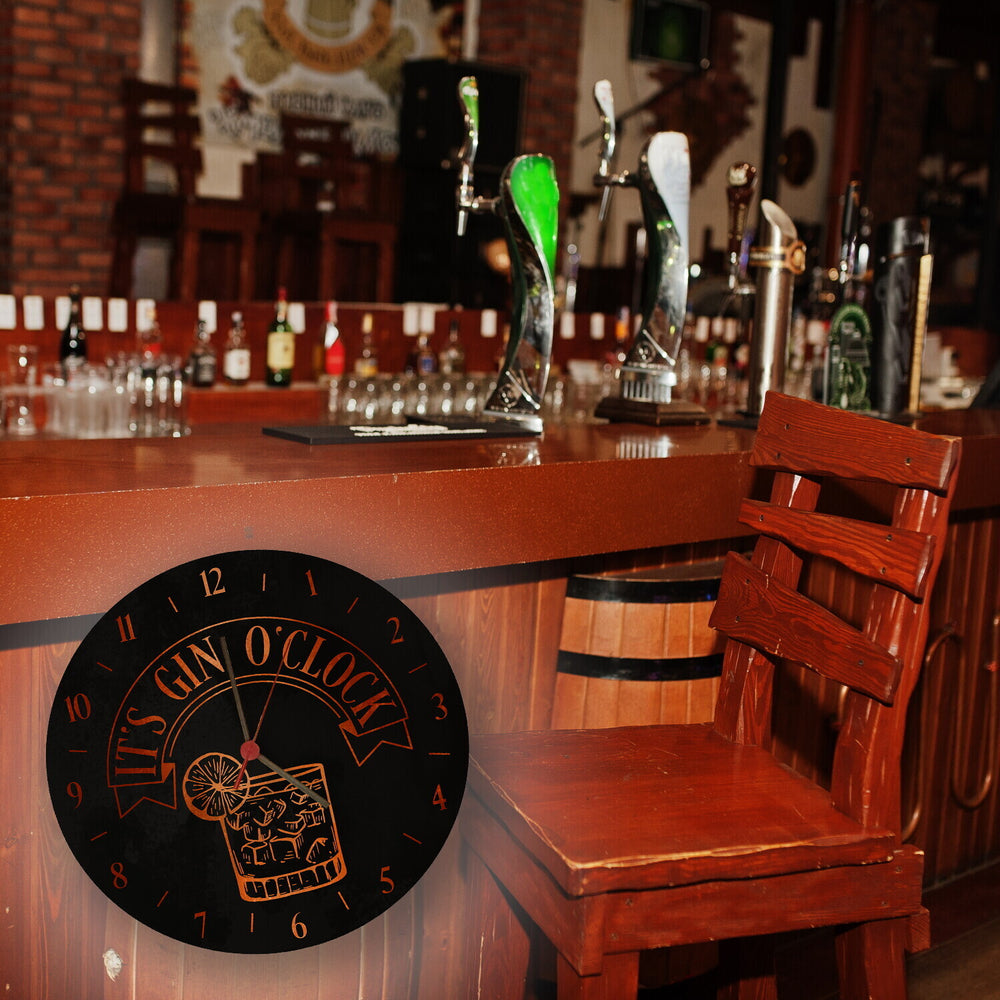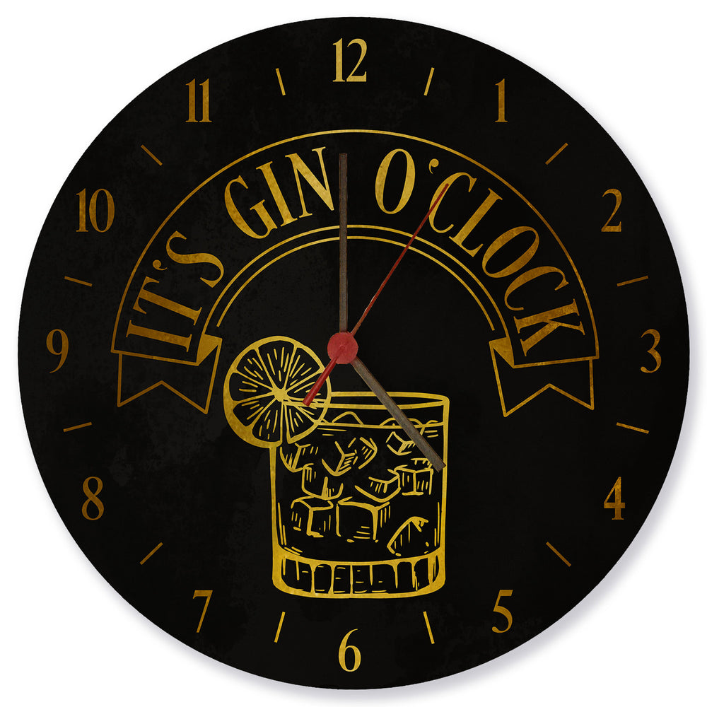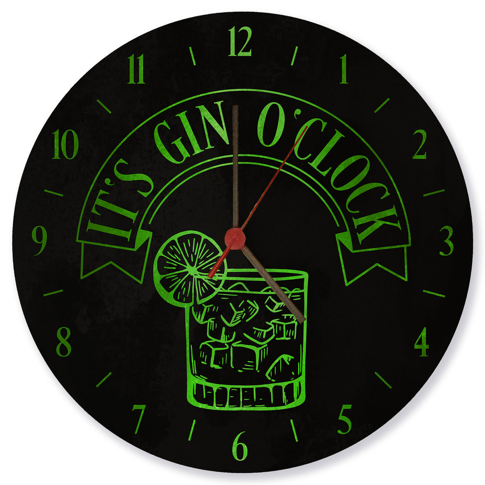 - Auf der Wanduhr steht in roter Farbe der Spruch: It's Gin O'Clock. Darunter ist ein Glas Gin, garniert mit einer Limettenscheibe, abgebildet. Die Uhr zeigt die vollen Stunden und die Zwischenstriche sind die halben Stunden dazwischen.