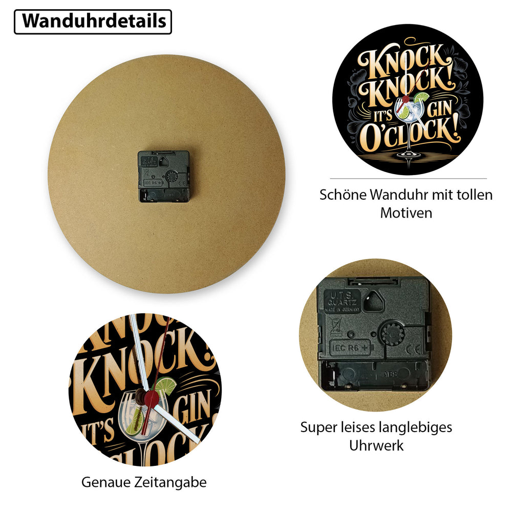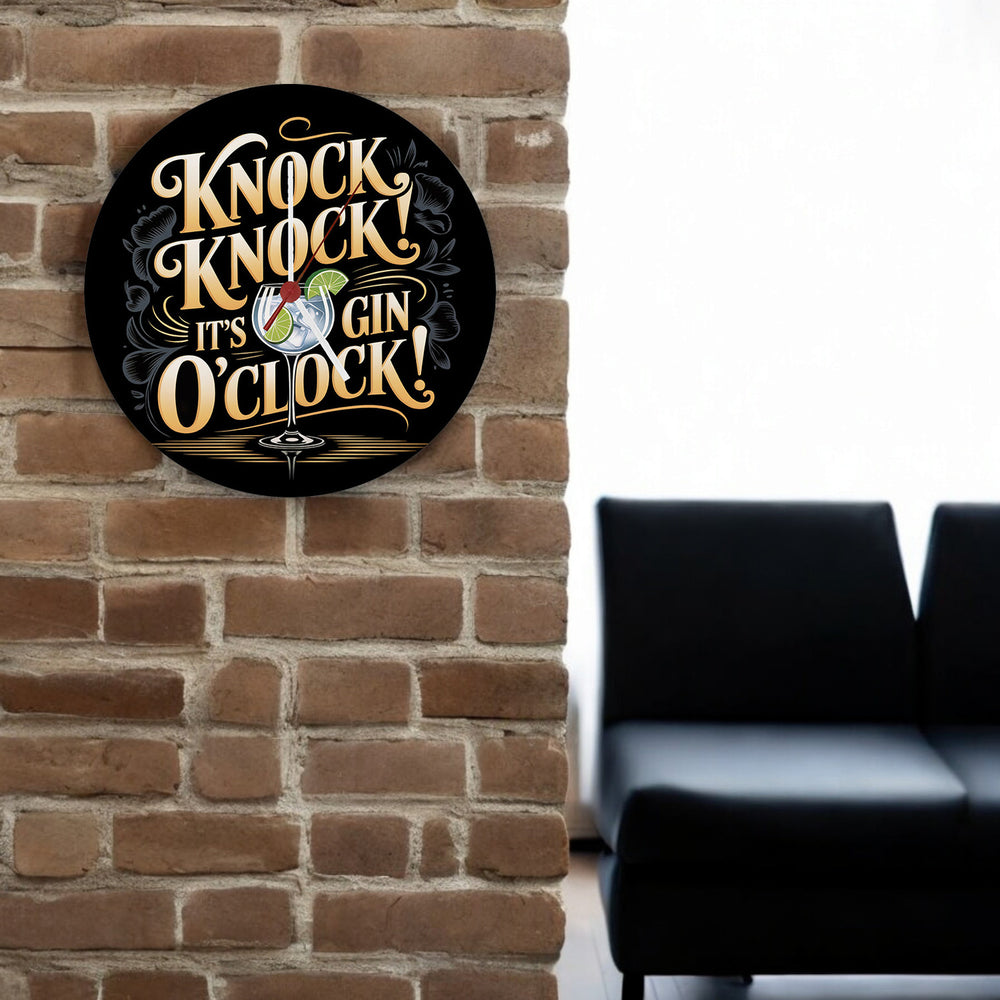 - Diese Wanduhr beeindruckt mit einem lebendigen Design: Der Spruch "Knock Knock! It's Gin o'clock!" schimmert in kunstvoll geschwungenen goldenen Buchstaben auf einem eleganten schwarzen Hintergrund. Ein perfekt gekühlter Gin Tonic mit Limettenscheibe und glitzernden Eiswürfeln strahlt in weichem, diffusem Licht. Florale Muster ergänzen den luxuriösen Look.