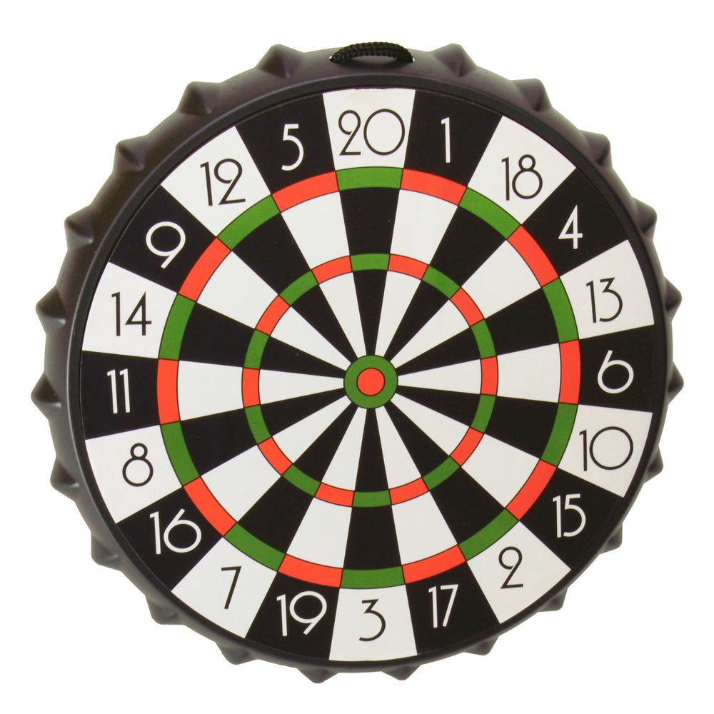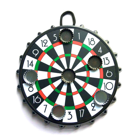 - Lieferumfang: 1x Kronkorken Darts Partyspiel bestehend aus 1x Dartscheibe, 5x Kronkorken schwarz und 5x Kronkorken silber.