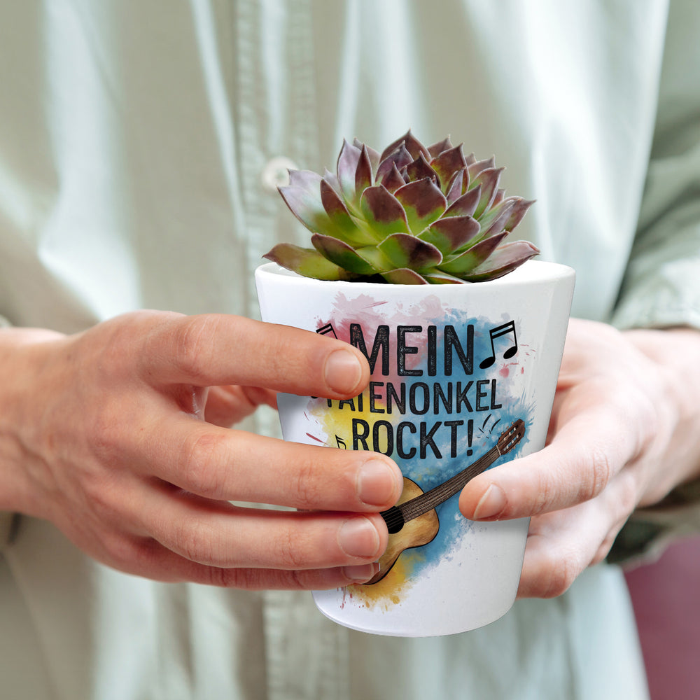 - Dieses Meisterwerk eines Blumentopfs ist ein wahrer Hingucker. Der weiße Hintergrund hebt den frechen Schriftzug "MEIN PATENONKEL ROCKT!" hervor. Eine Gitarre im Zentrum, umgeben von tanzenden Noten und bunten Aquarellspritzern in Rosa, Blau und Gelb, verleiht ihm eine lebendige, künstlerische Note.