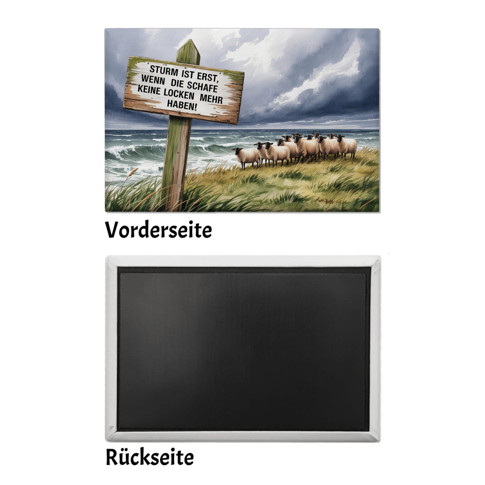 - Entdecken Sie den Nordsee Sturm Landschaft Souvenir Magnet mit einem kunstvollen Aquarellmotiv! Der Magnet zeigt eine stürmische Meereslandschaft mit Schafen auf einer Düne, begleitet von dem humorvollen Spruch: "Sturm ist erst, wenn die Schafe keine Locken mehr haben!". Das Design vereint norddeutschen Charme und maritimes Flair.