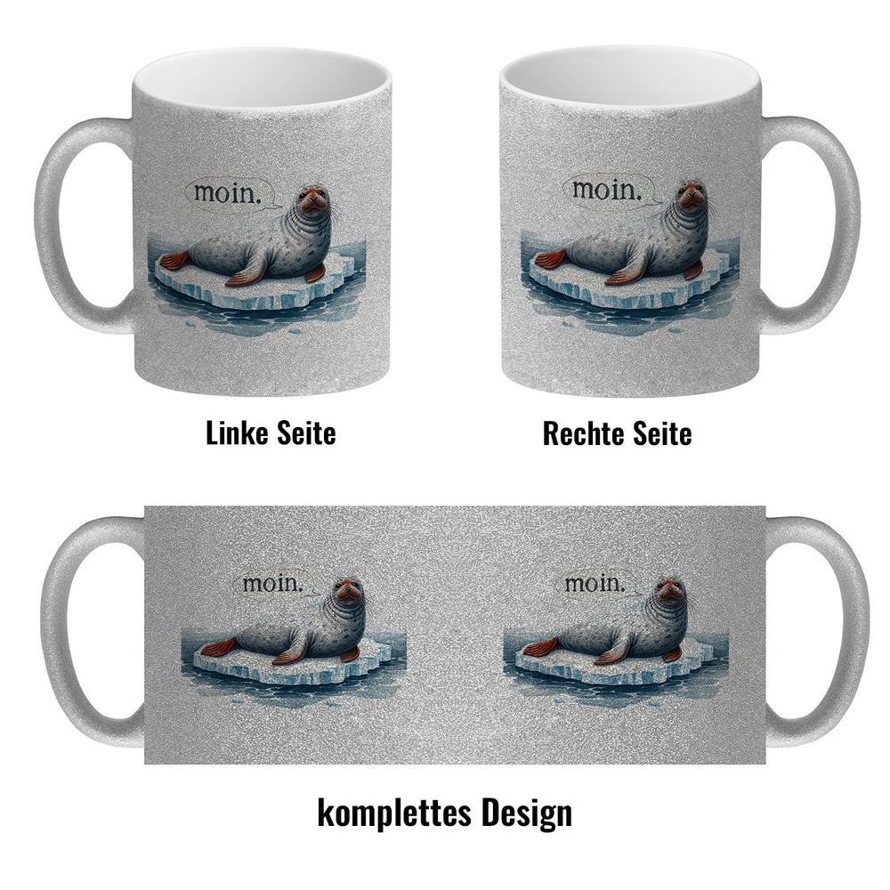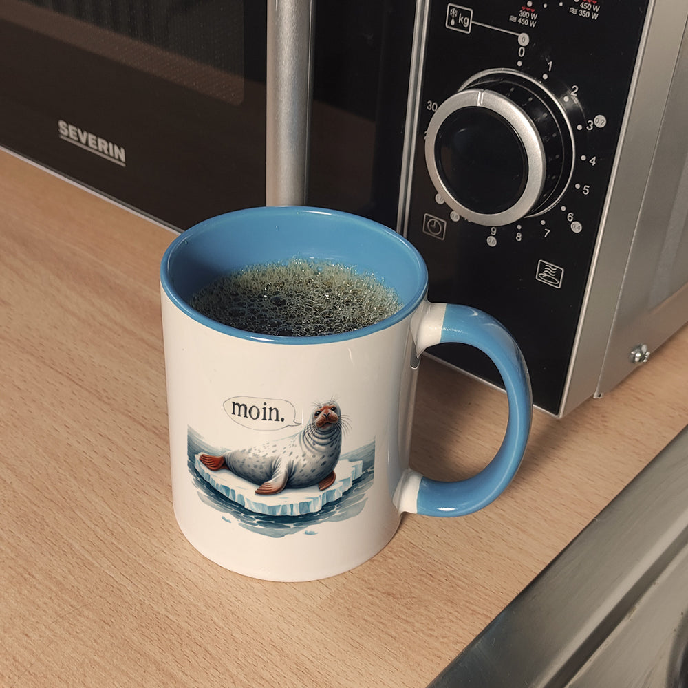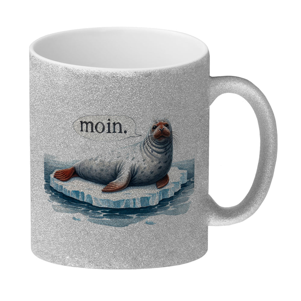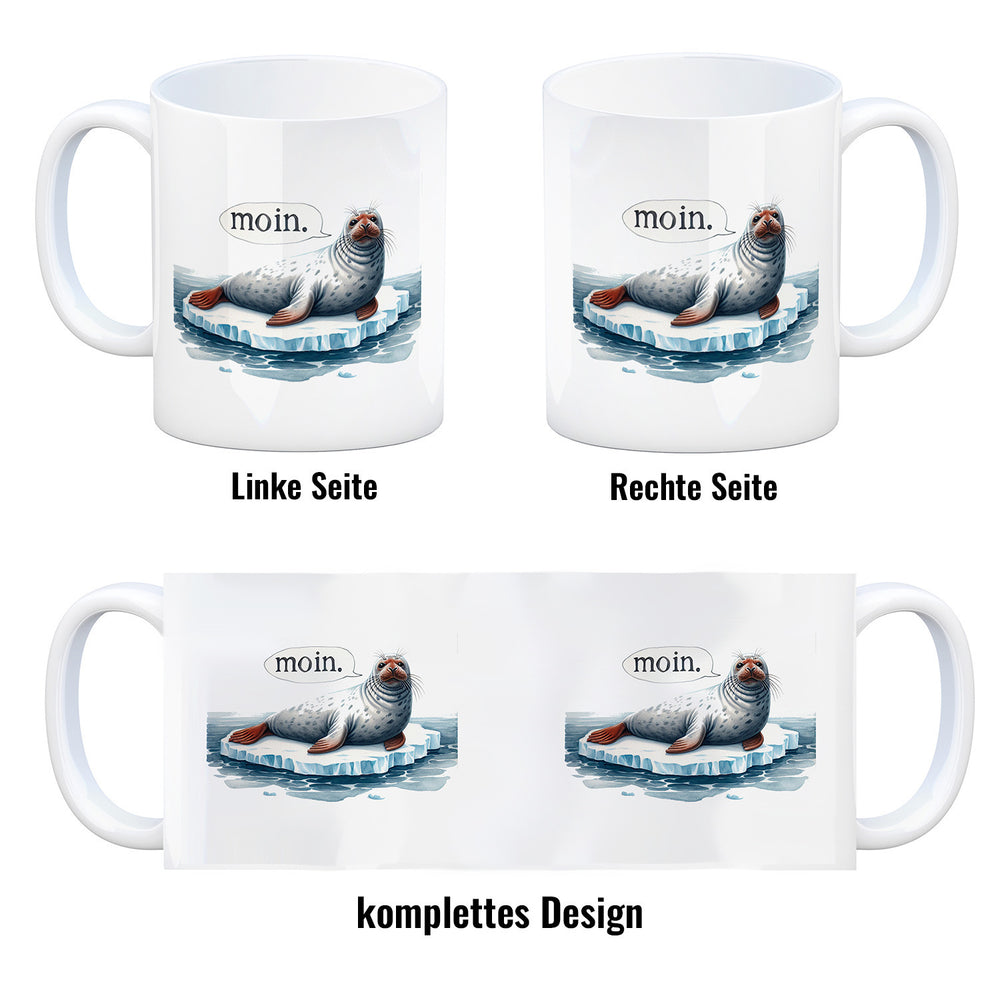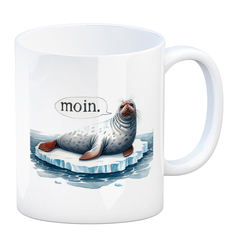 - 1x Robbe auf Eisscholle Kaffeebecher mit Spruch Moin in der gewählten Ausführung