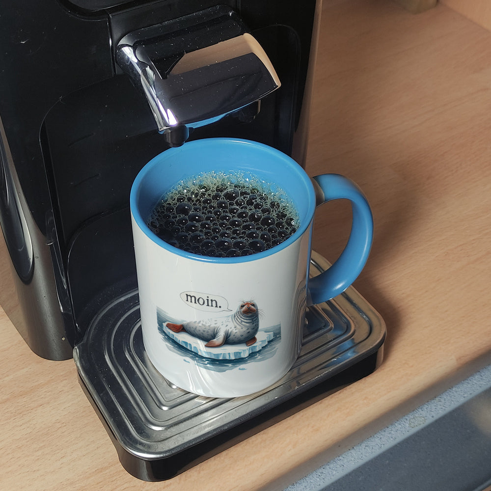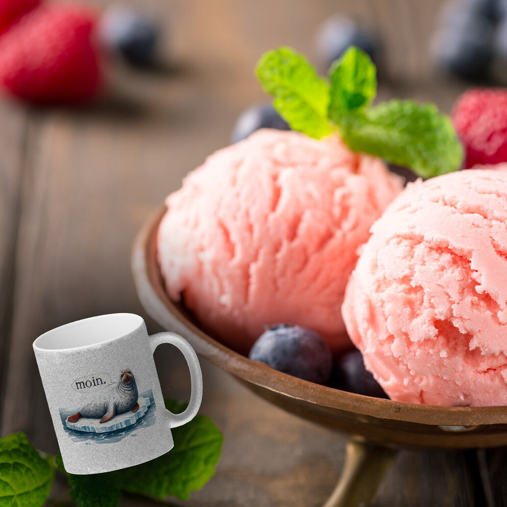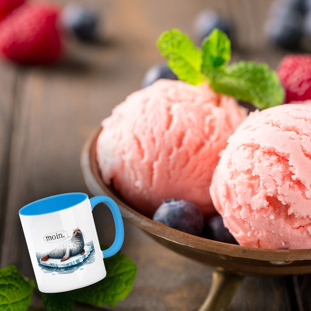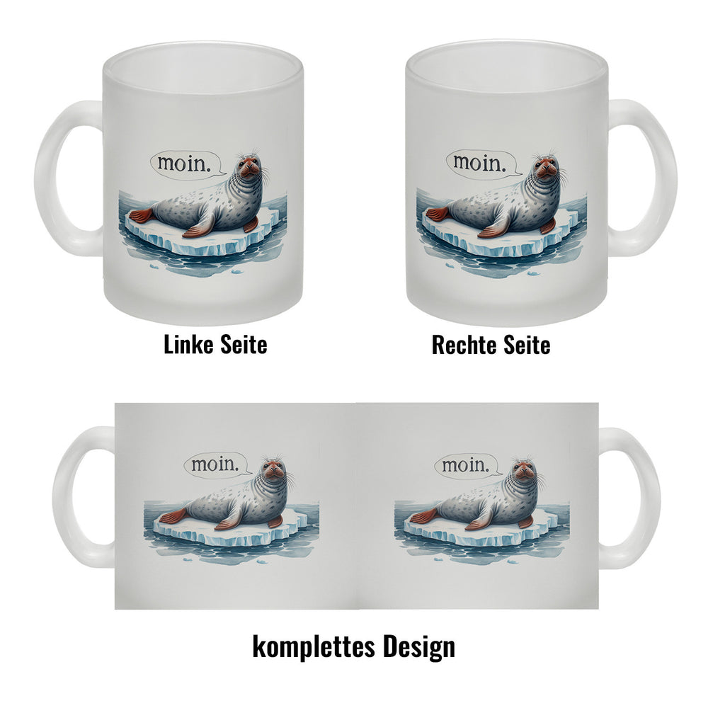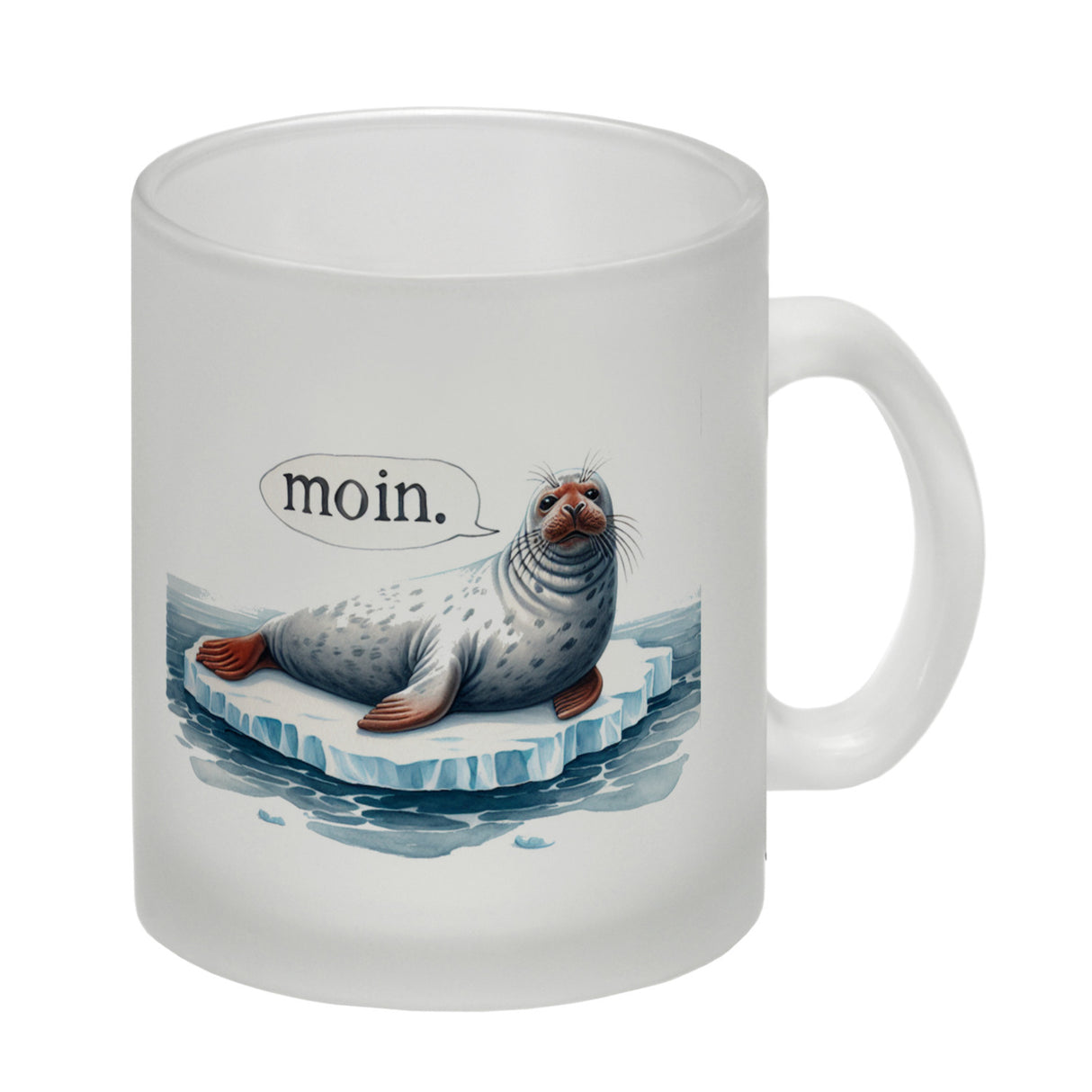 - 1x Robbe auf Eisscholle Kaffeebecher mit Spruch Moin in der gewählten Ausführung