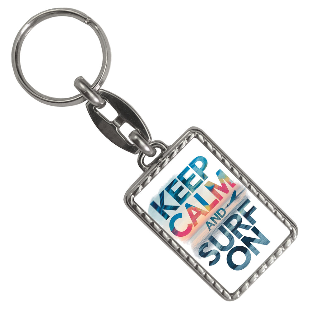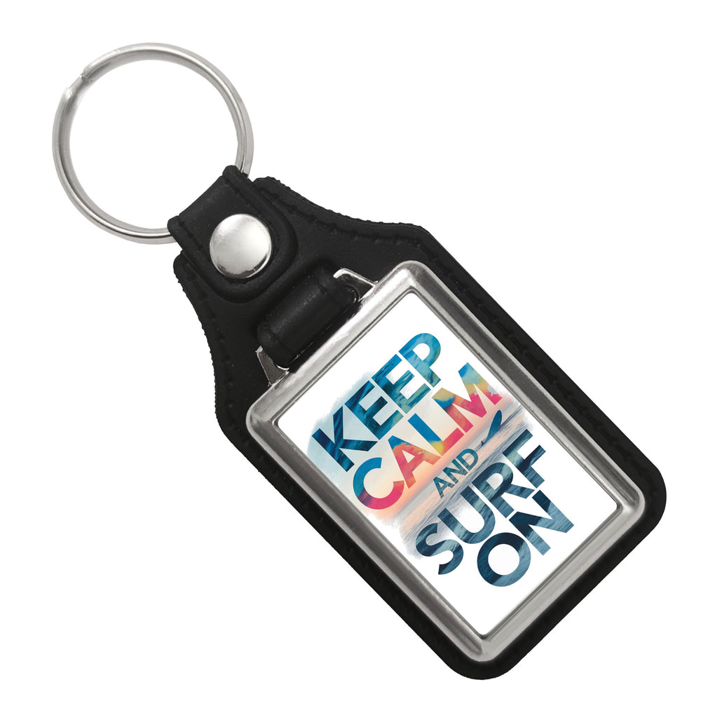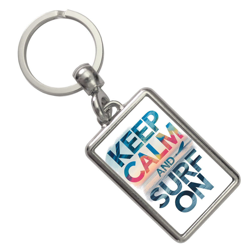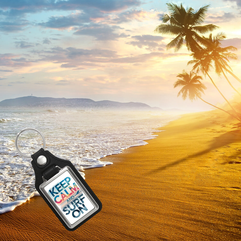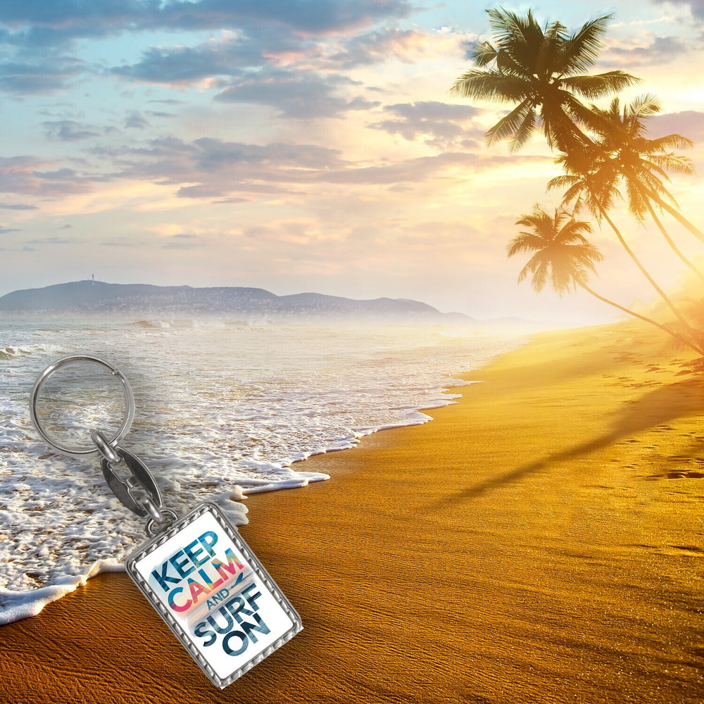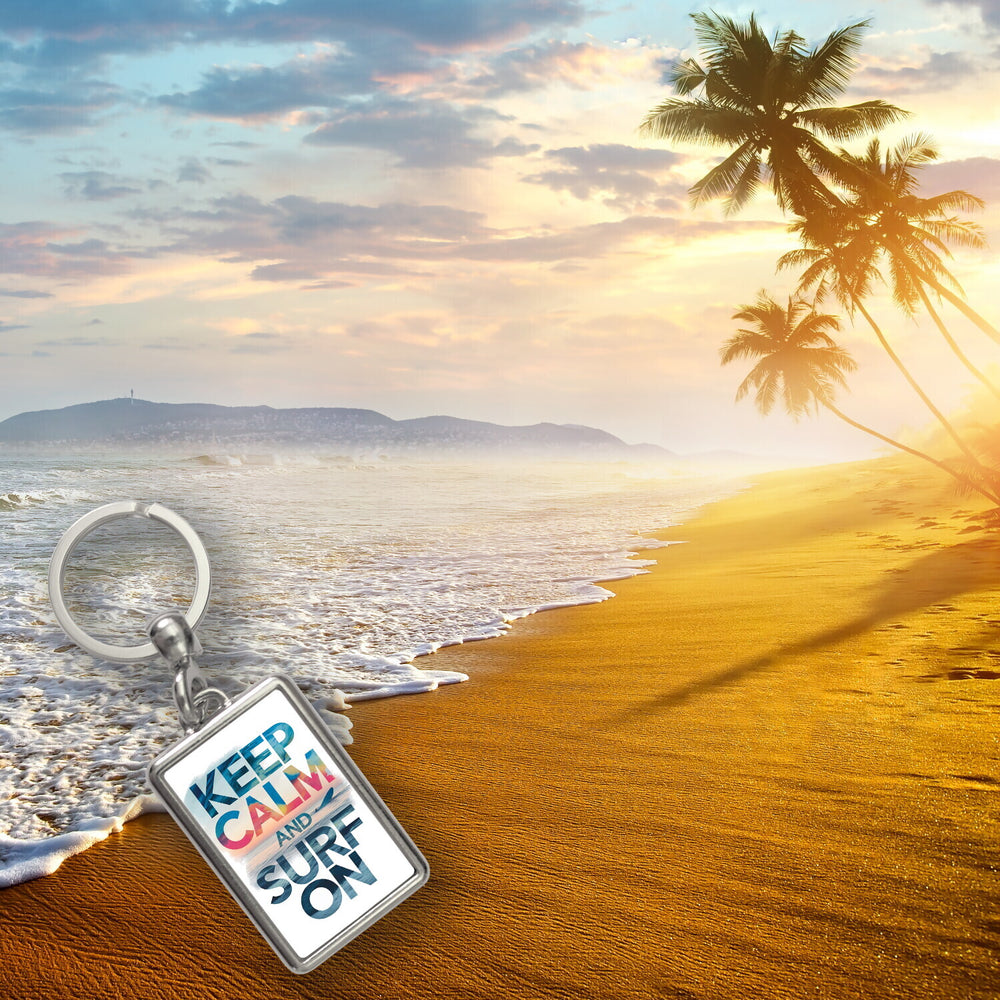 - Dieser Schlüsselanhänger zeigt ein farbenfrohes und sommerliches Aquarell-Design. Im Mittelpunkt steht der inspirierende Spruch "Keep Calm and Surf On". Auf einem weißen Hintergrund reitet ein Surfer eine beeindruckende Welle, während der Himmel in Blau-, Rosa- und Orangetönen schimmert. Perfekt für alle, die das Meer lieben!