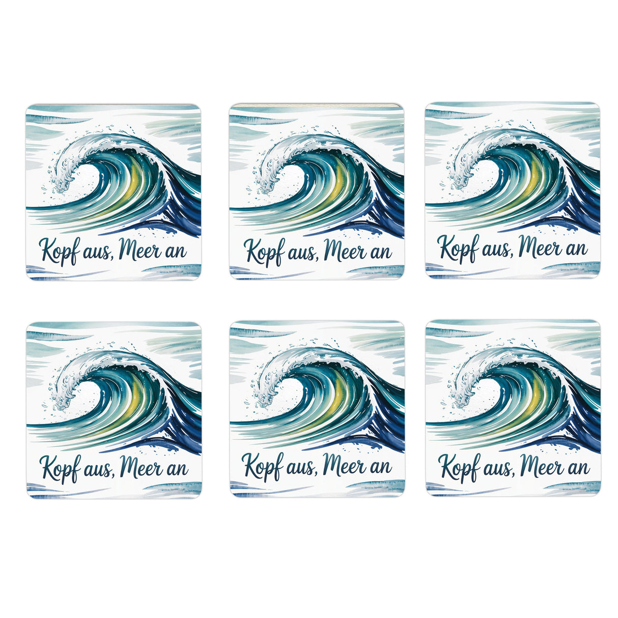 - Diese Wellen-Untersetzer im 6er Set sind ein echter Hingucker! Sie zeigen ein fesselndes Aquarellmotiv mit einer stilisierten Welle in Türkis und Tiefblau. Der elegante Spruch "Kopf aus, Meer an" ist einladend eingraviert. Die weißen und hellblauen Streifen im Hintergrund verleihen dem Design eine erfrischende, maritime Note.