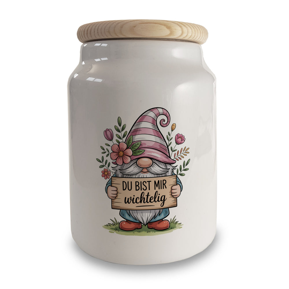 Diese bezaubernde Keksdose zeigt einen niedlichen Wichtel im farbenfrohen Stil. Er trägt eine rosa-weiße Zipfelmütze und ein hellblaues Outfit, geschmückt mit Blumen, die seine Botschaft "DU BIST MIR wichtig" unterstreichen. Mit einem bunten Blume Hinweise: Material: Keramik und Holz / Volumen 650 ml