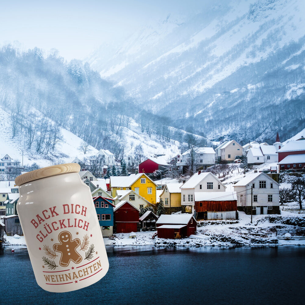 Diese zauberhafte Keksdose präsentiert ein festliches Design mit einem fröhlichen Lebkuchenmann, umgeben von Sternen und Tannenzweigen. Der Schriftzug "BACK DICH GLÜCKLICH" in lebhaftem Rot macht die Dose zum Hingucker. Die warmen Rot-, Beige- und Hinweise: Material: Keramik und Holz / Volumen 650 ml