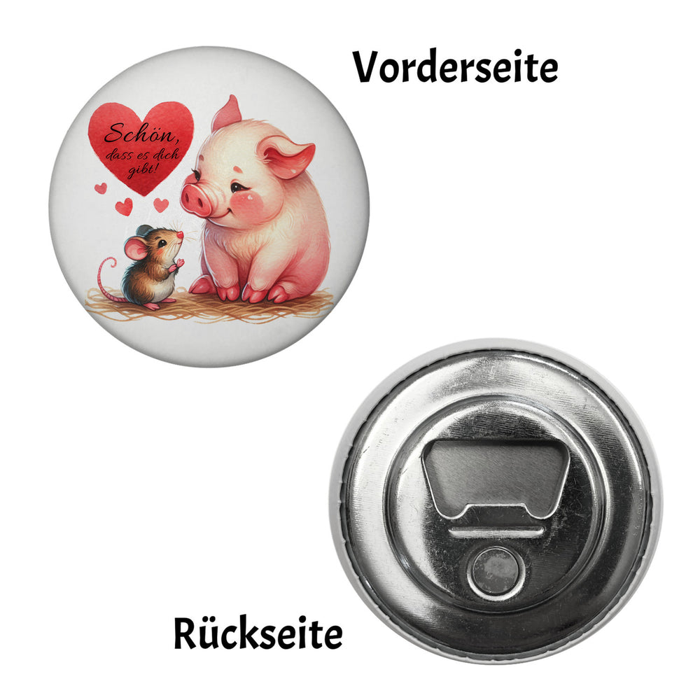 • 1x Schwein mit Maus und Herz Magnet rund mit Spruch Schön dass es dich gibt in der gewählten Ausführung