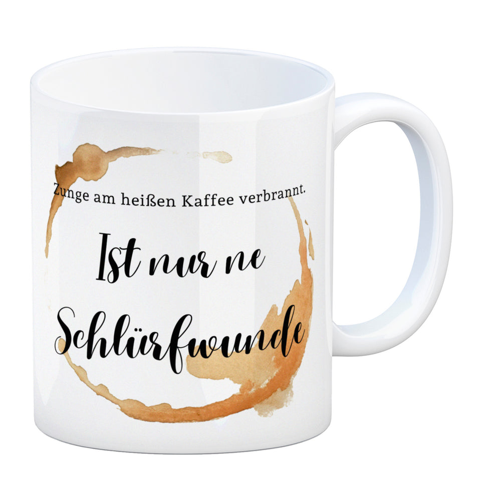 - 1x Kaffeefleck Kaffeebecher mit Spruch Zunge am heißen Kaffee verbrannt in der gewählten Ausführung