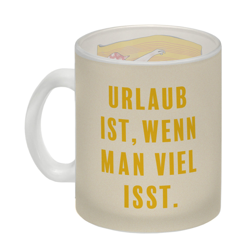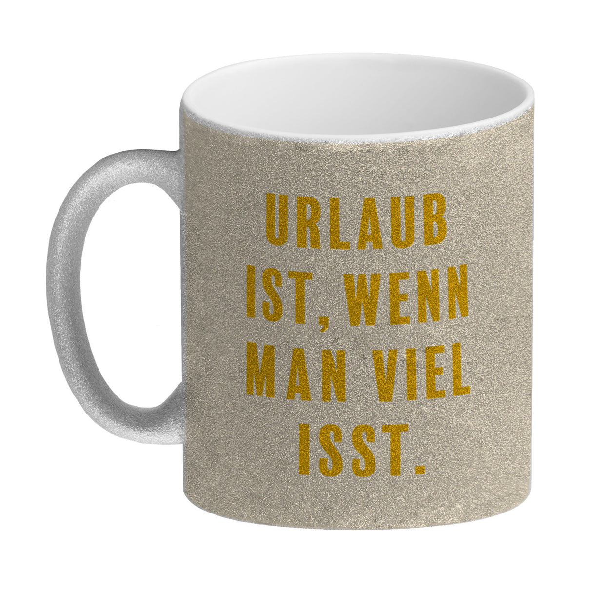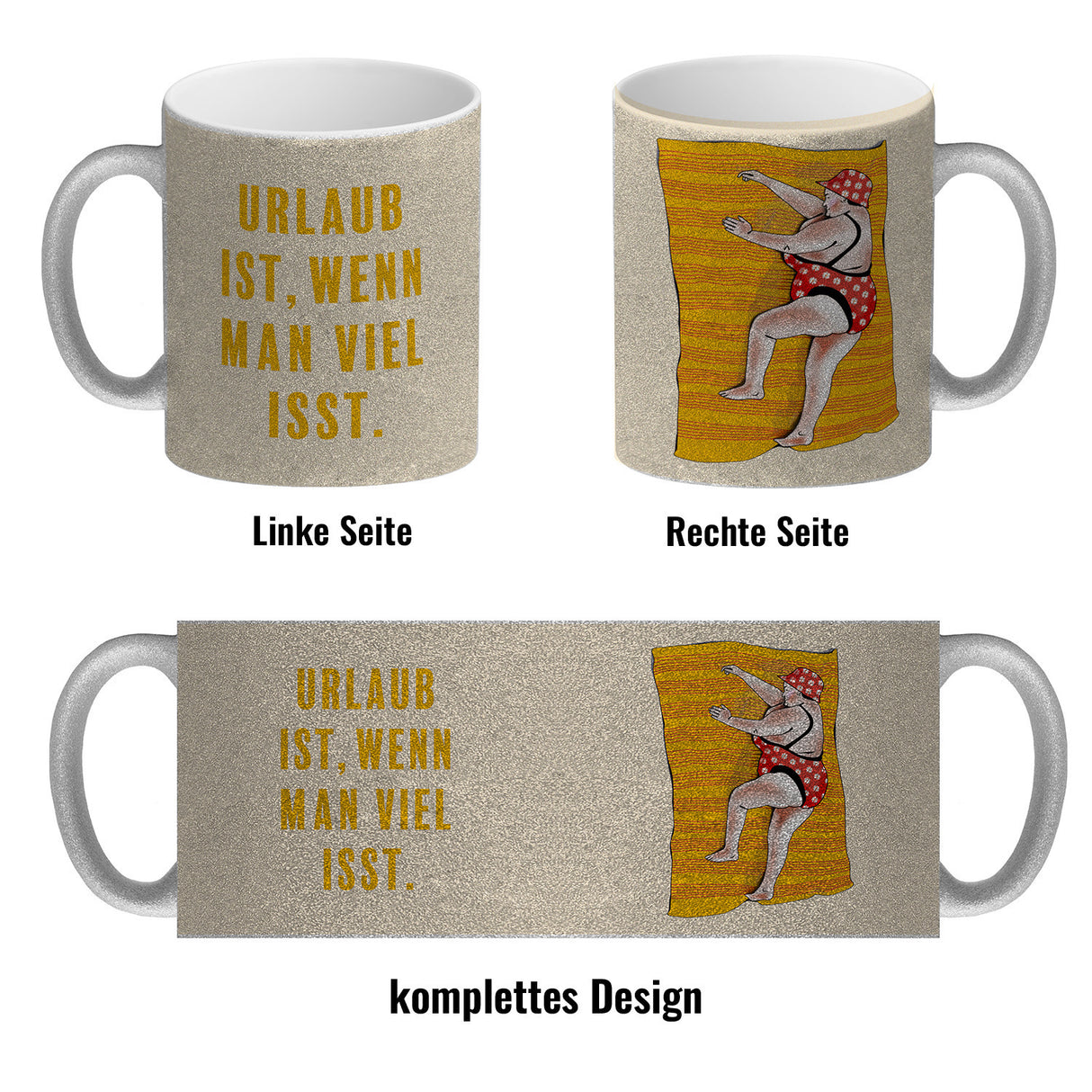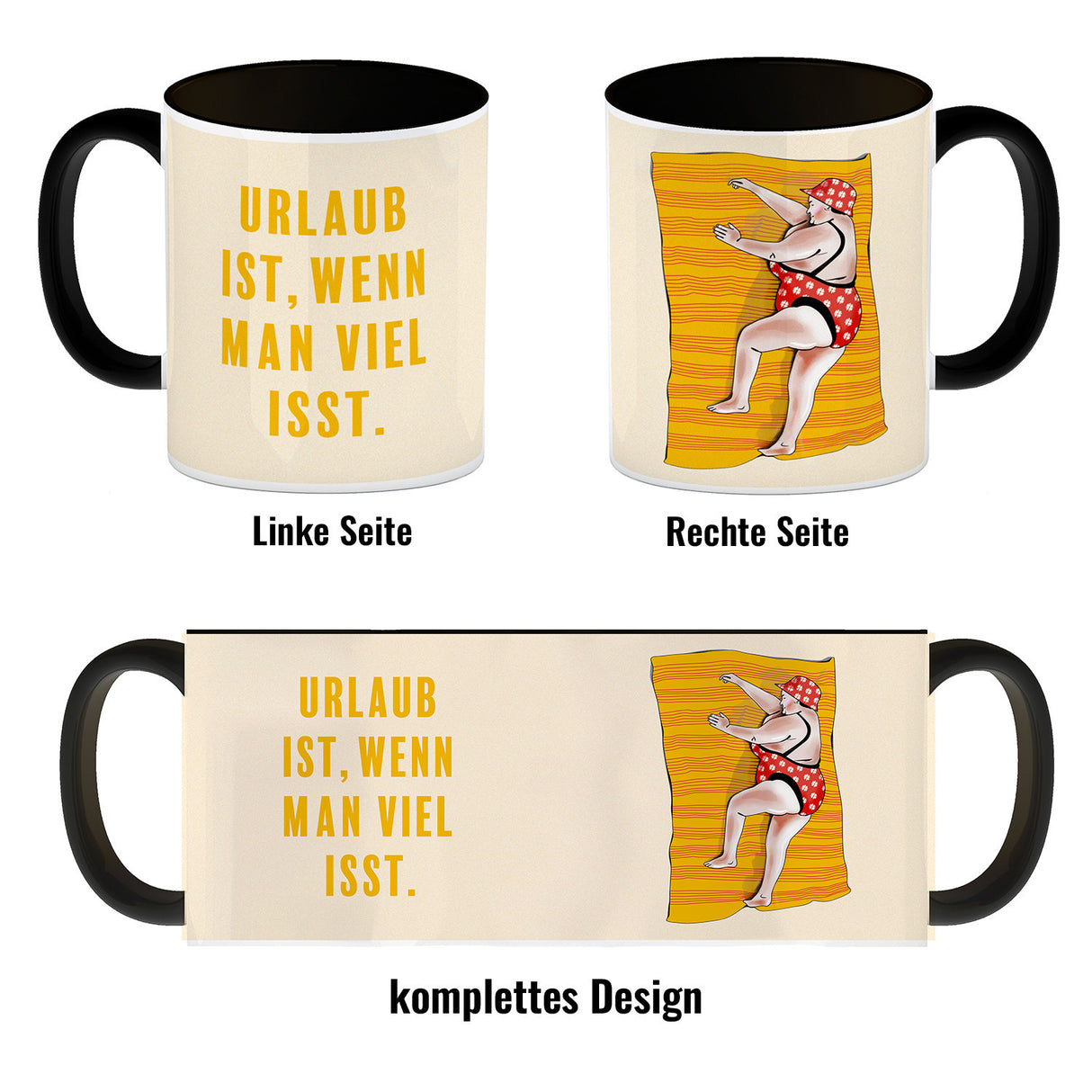 - 1x Kaffeebecher Urlaub ist, wenn man viel isst mit Strandmotiv und Spruch zum Thema Essen in der gewählten Ausführung
