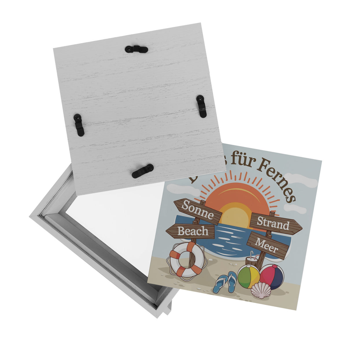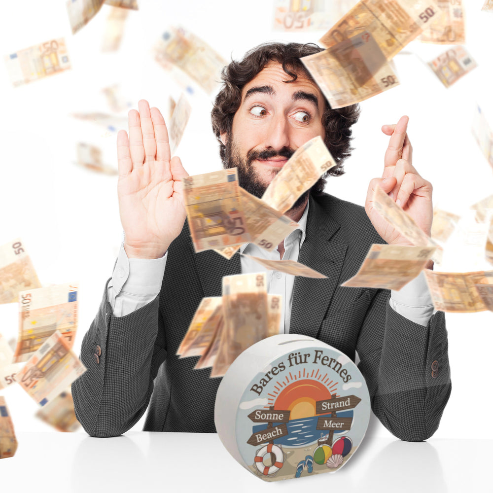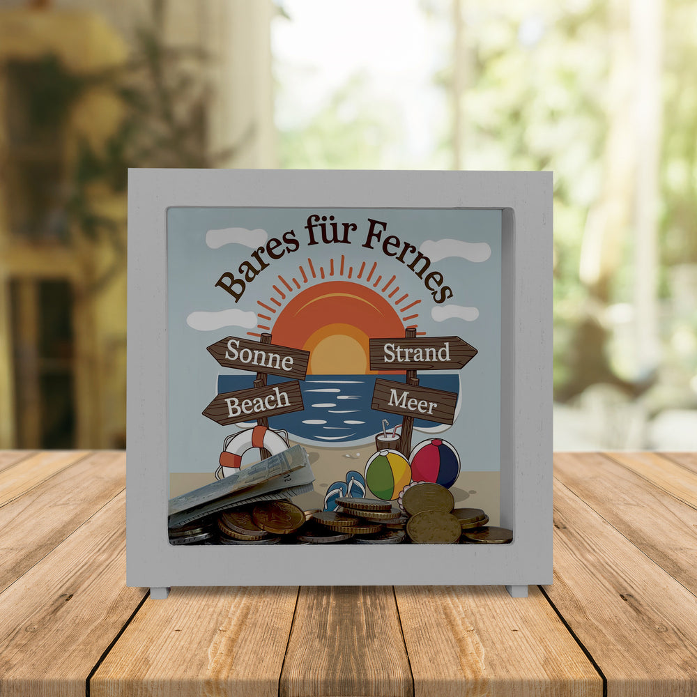 Starte dein Abenteuer-Sparprogramm mit unserer „Sonnenuntergang über dem Meer“-Spardose – Bares für Fernes! Perfekt für Fernwehgeplagte und Urlaubsfanatiker, bringt diese Spardose sofort Ferienstimmung in dein Zuhause. Wunderschönes Design mit Sonnenuntergang, Strand und fröhlichen Flip-Flops, das Sparen fast wie ein Mini-Urlaub macht. Erhältlich in drei Varianten: schlichte Holzspardose, hochwertige ovale Keramik-Version oder exklusive Rahmen-Variante aus Holz mit Sichtfenster – ideal für Geldgeschenke. Gefertigt in unserer Spardosen-Manufaktur in Deutschland, überzeugt diese Spardose mit Liebe zum Detail. Stell dir vor, du sitzt entspannt am Strand, während die Sonne hinter dem Horizont verschwindet, und das Meeresrauschen deine Ohren verwöhnt. Hol dir dieses Gefühl nach Hause! Holzschilder mit den Aufschriften Sonne, Strand und Meer sorgen dafür, dass du weißt, wohin du dein gespartes Geld investieren solltest. Der bunte Strandball und die Kokosnuss mit Strohhalm komplettieren das Urlaubsdesign.Diese Spardose ist perfekt für große Pläne! Egal, ob du auf deinen Traumurlaub sparst oder einfach nur Geld für entspannte Strandtage zurücklegen möchtest, unser Design macht das Sparen zu einem Vergnügen. Ein tolles Geschenk für Freunde oder Familie, das immer an Urlaubsfreuden erinnert. Bares für Fernes – los geht’s!