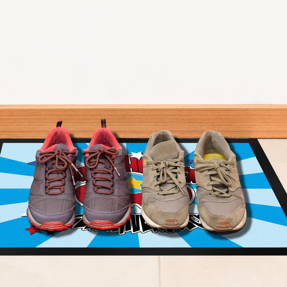 - Vor der Kinderzimmertür lässt sich diese Fußmatte gut hinlegen und macht das Zimmer zur Superhelden-Basis. Eine tolle Geschenkidee für den kleinen Superhelden zu Hause.
