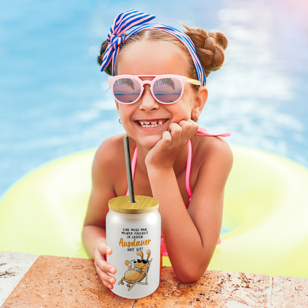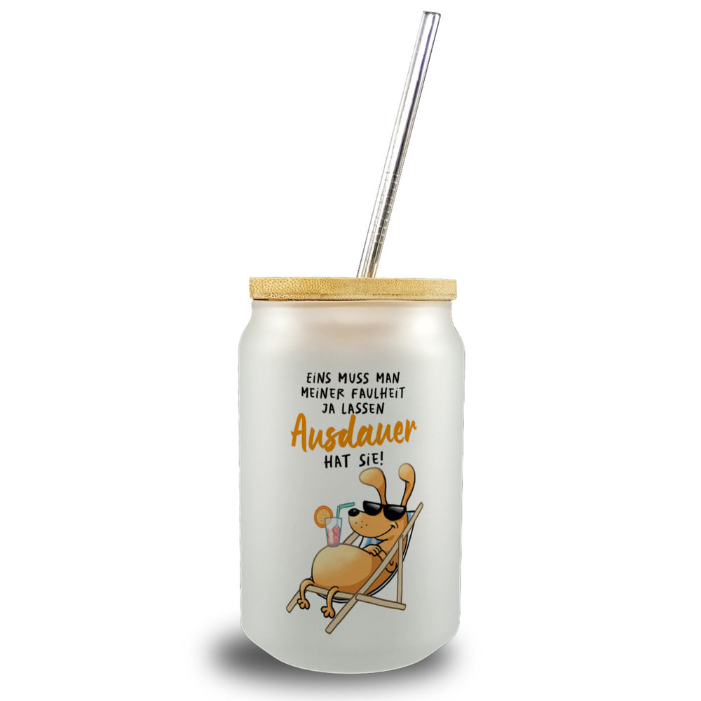 Fauler Hund Trinkglas mit Bambusdeckel mit Spruch Meine Faulheit hat Ausdauer