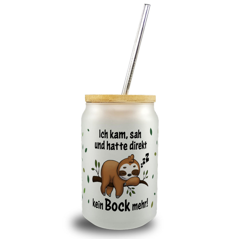Faultier Trinkglas mit Bambusdeckel mit Spruch Ich kam sah und hatte direkt kein Bock mehr