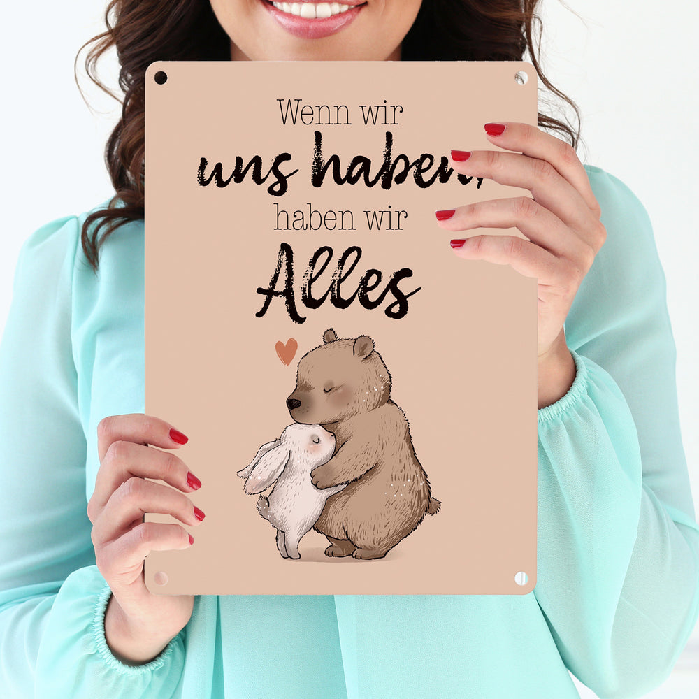 Hase und Bär Metallschild in 15x20 cm mit Spruch Wenn wir uns haben, haben wir Alles