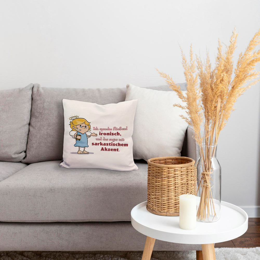 • Dieses neckische Kissen mit Engel Motiv ist eine fantastische Geschenkidee für jeden Scherzkeks zum Geburtstag. Auf dem Artikel steht der witzige und ironische Spruch: Ich spreche fließend ironisch, und das sogar mit sarkastischem Akzent. Darüber hinaus haben Sie ein schönes Dekokissen.