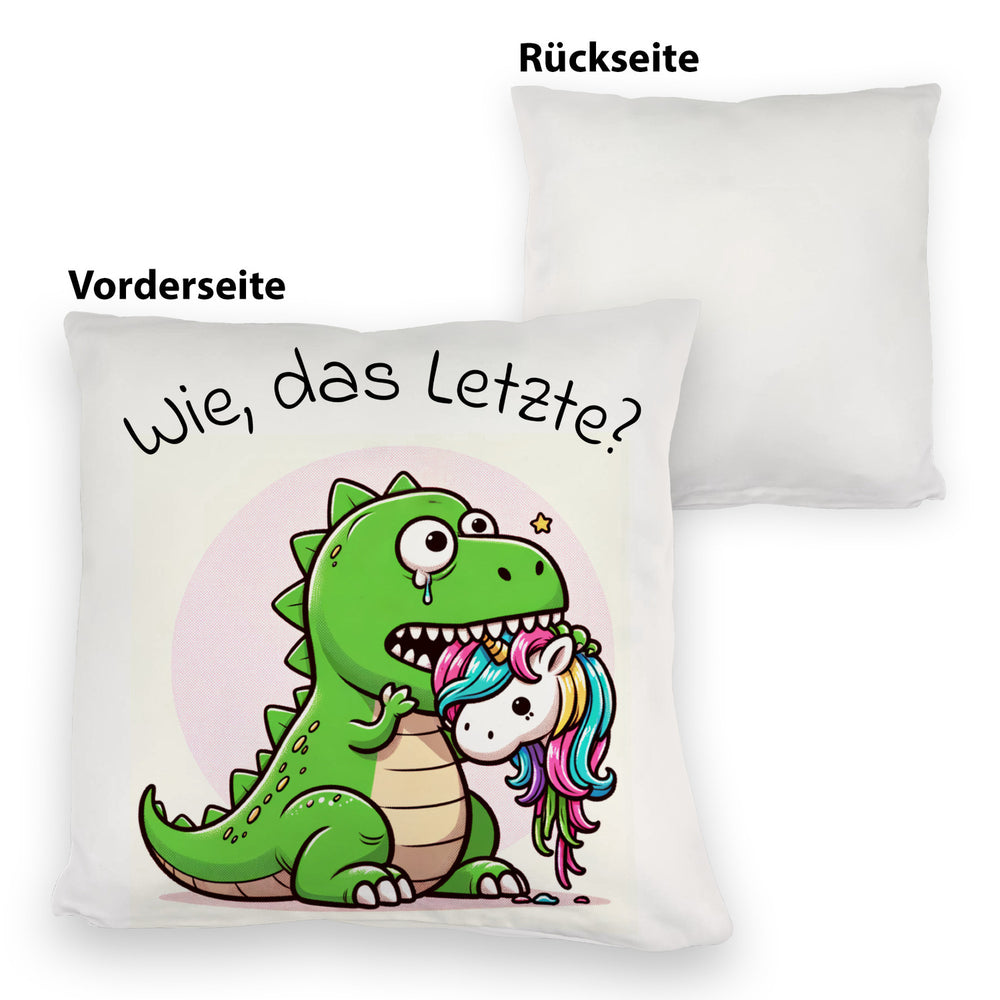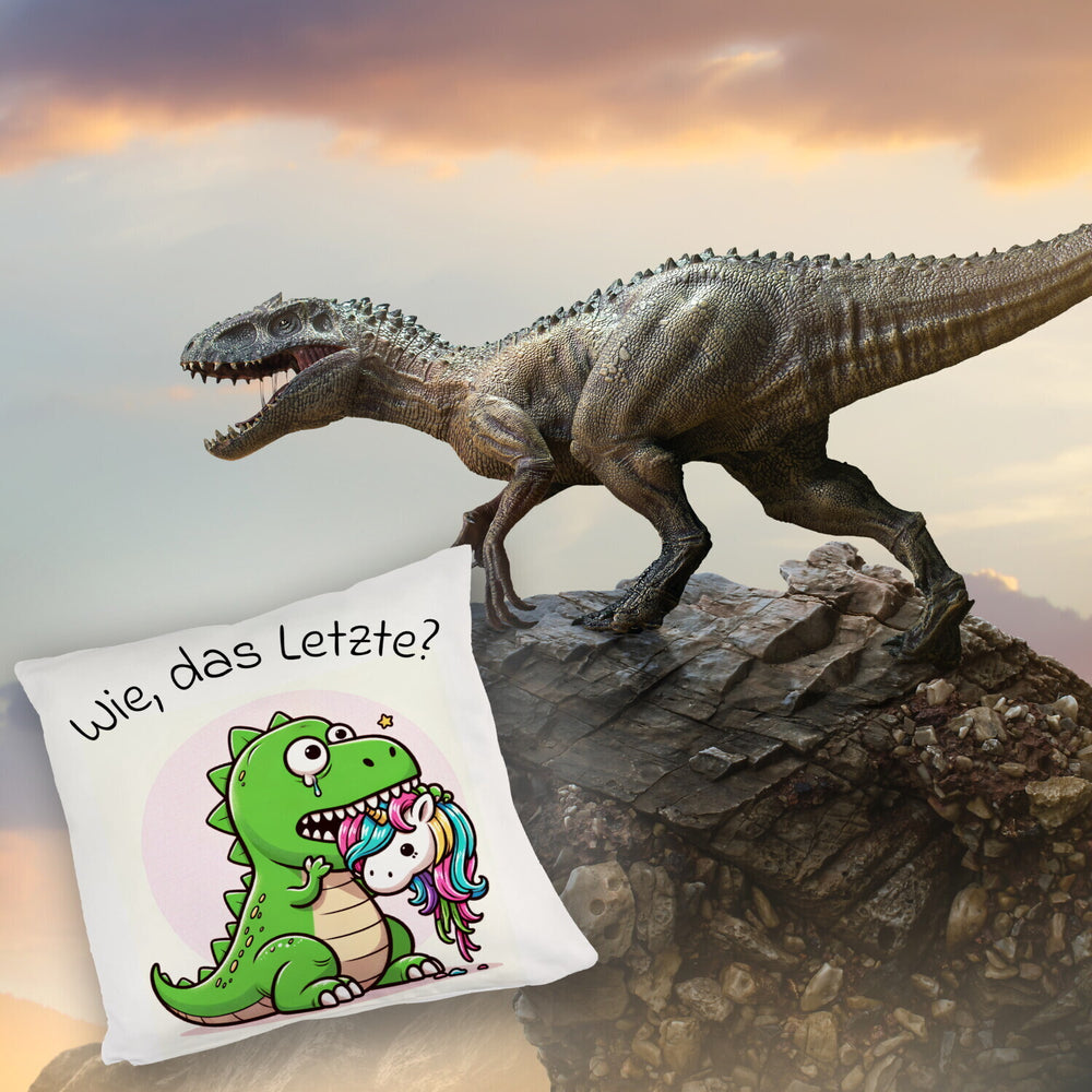 - Knuddel-Alarm! Unser "Das letzte Einhorn" Kissen ist die perfekte Mischung aus "Aww!" und "Oh nein!". Ein dusselig schauender T-Rex hat mit grünen Schuppen und großem Maul scheinbar das letzte Einhorn gesnackt – bunte Haare und weiße Hufe noch in Sicht!