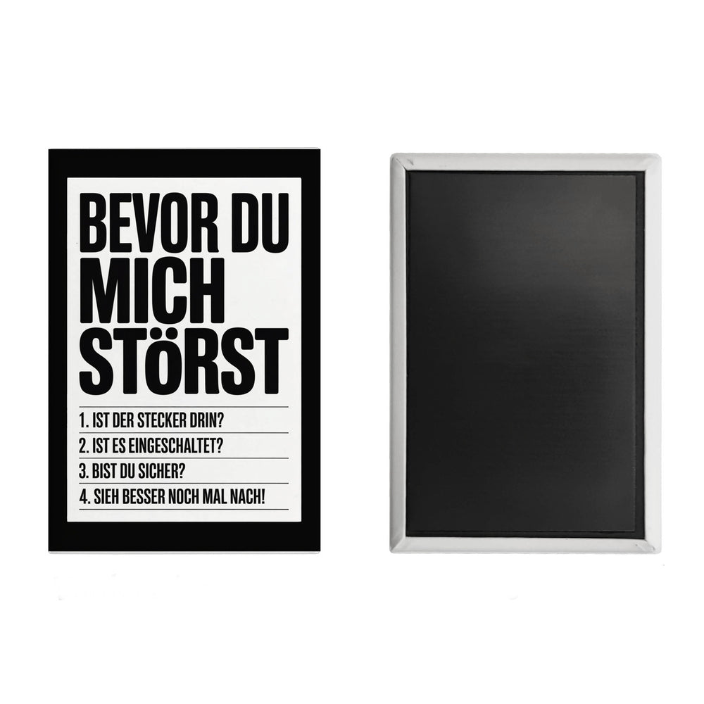 • Dieser eckige Magnet besticht durch sein grafisches Posterdesign und eine auffällige Typografie auf schwarzem Hintergrund. Der Text "BEVOR DU MICH STÖRST" ist in großer, serifenloser Schrift gehalten, gefolgt von vier cleveren Fragen. Diese klare Hierarchie zieht alle Blicke magisch an!
