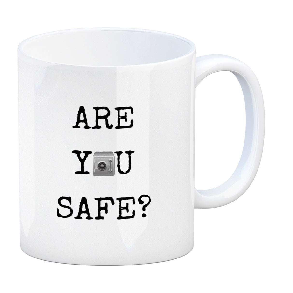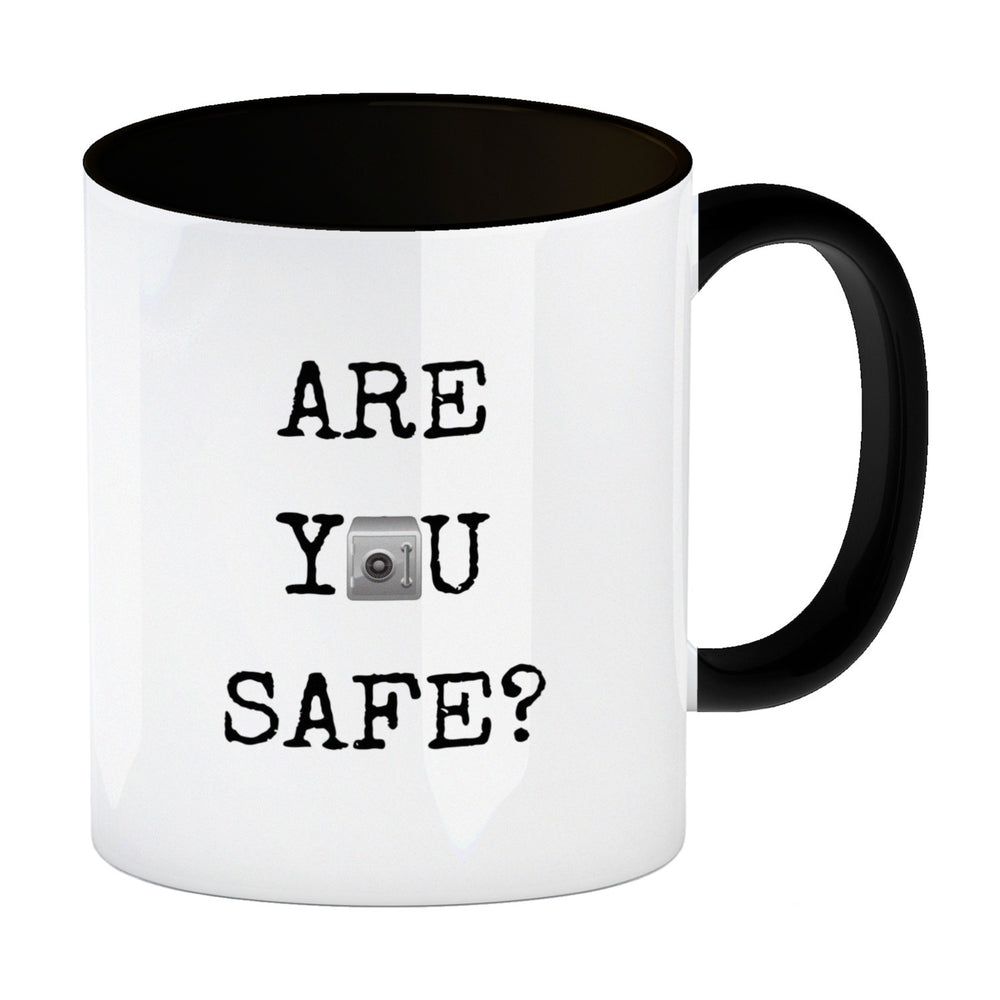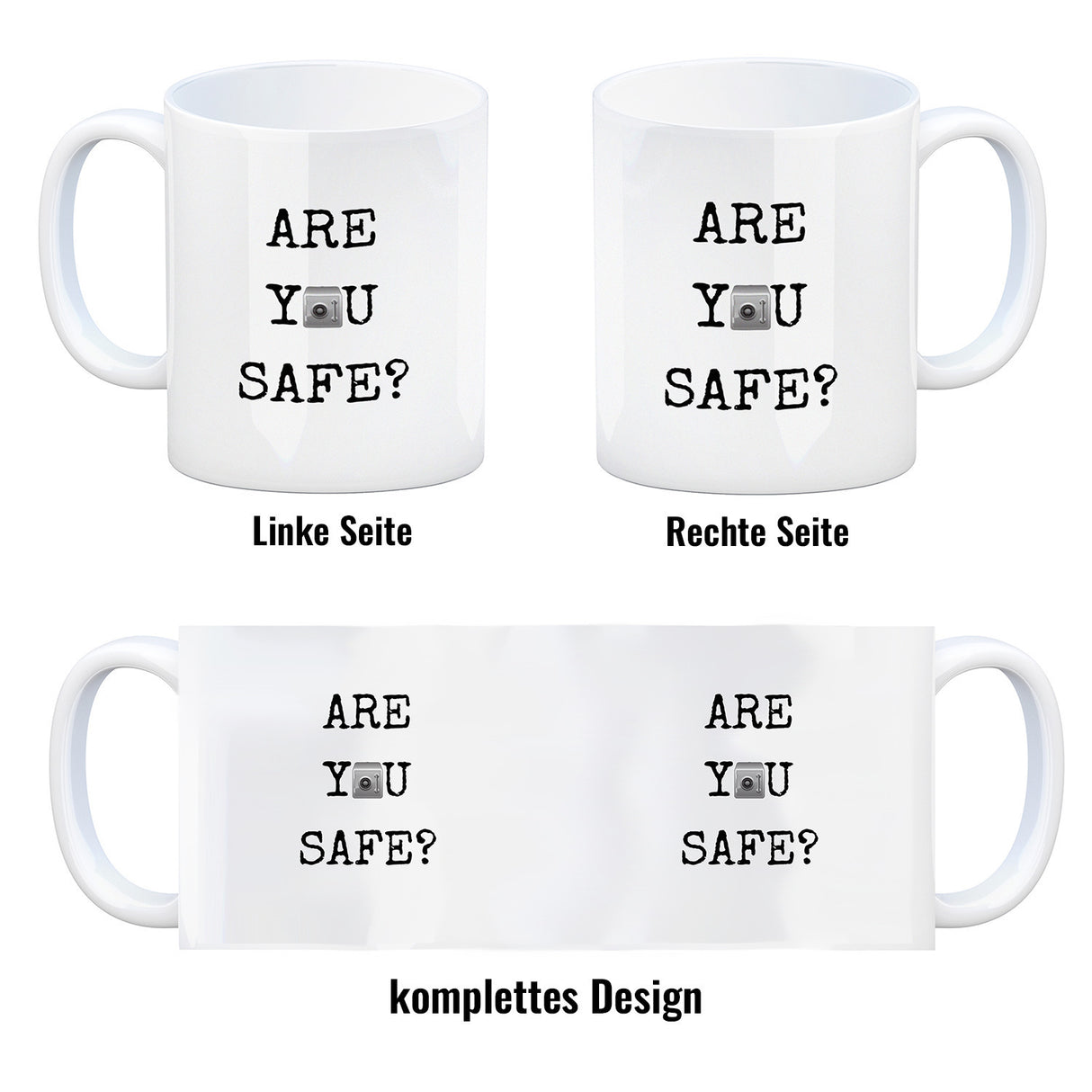 • Der lustige Kaffeebecher mit Denglisch Motiv ist ein super Geschenk für Bankkaufmänner oder Spaßvögel zum Wichteln. Er beinhaltet den nicht ganz richtig übersetzten Spruch Are you safe? und wird Ihnen sicherlich viel Freude bereiten.