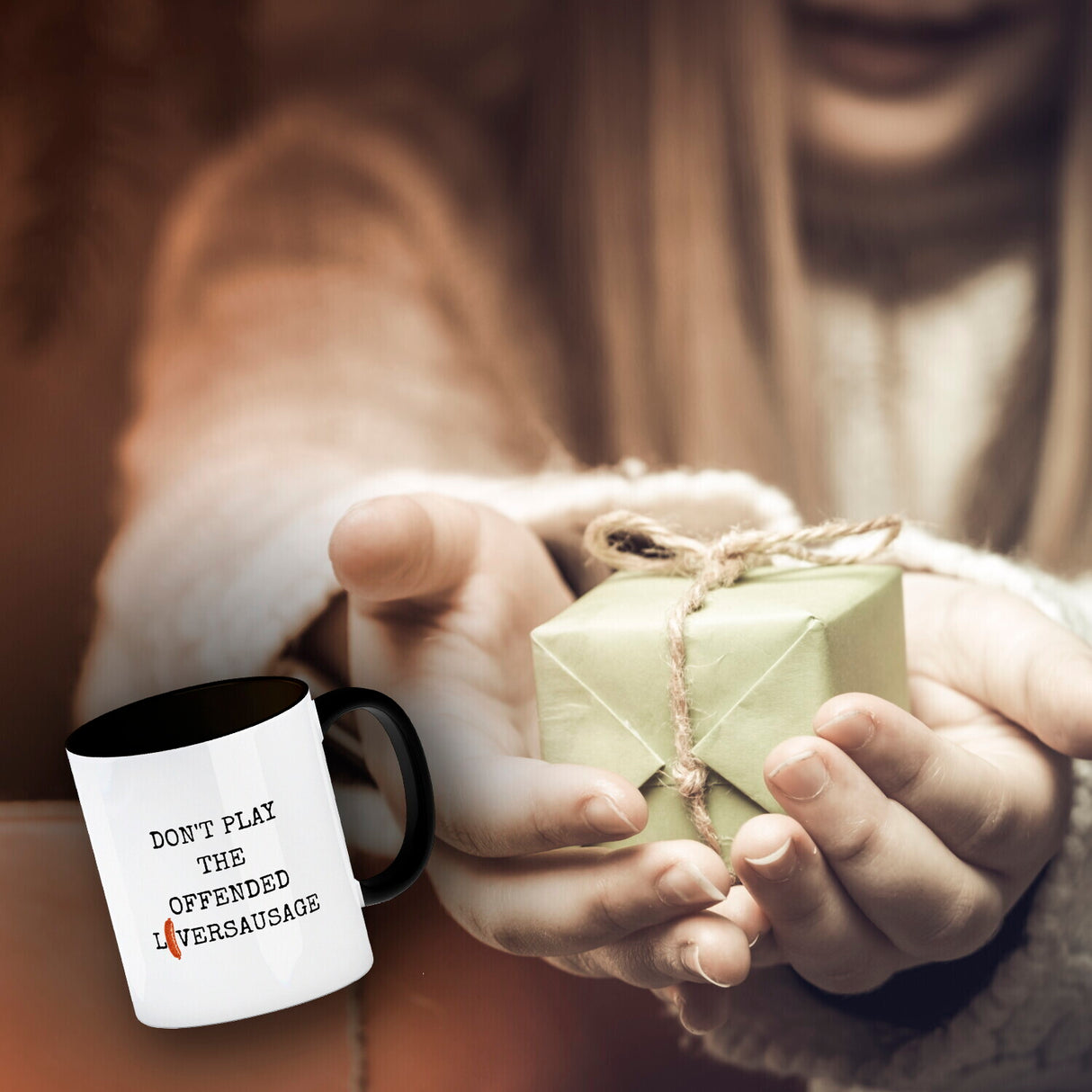 • Mit dem lustigen Kaffeebecher, der den nicht ganz richtig übersetzten Spruch Don't play the offended liversausage trägt, kann man seinen Freunden oder Kollegen eine besondere Überraschung bereiten. Der Becher ist sowohl zum Kaffeetrinken als auch für andere Getränke wie Tee bestens geeignet und somit perfekt für Wichteln am Schreibtisch im Büro oder privat bei Freunden.