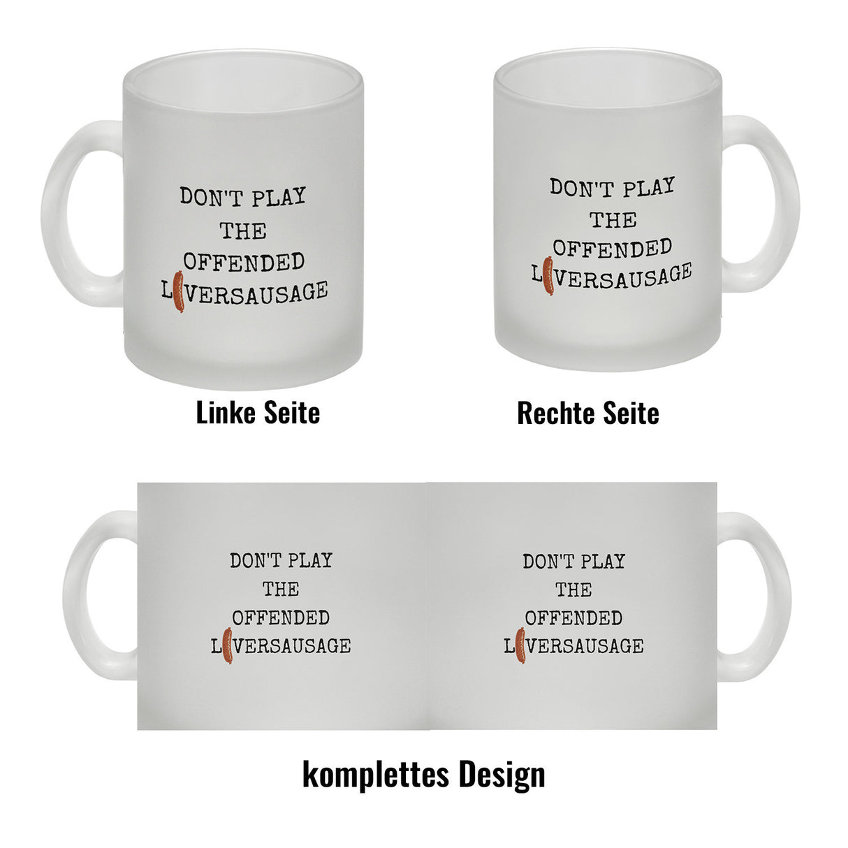 Gönnen Sie sich oder Ihren Liebsten eine Freude und kaufen Sie jetzt den Denglisch Kaffeebecher mit Spruch! Der Kaffeebecher ist in verschiedenen Varianten erhältlich: als weiße Standardtasse, mit farbigem Henkel und Innenseite, als edle Glastasse oder in der exklusiven Silberedition mit Glitzereffekt. Mit Sorgfalt in Handarbeit hergestellt und bestens geeignet für Kaffee oder Tee. Auf dem Becher steht der lustige nicht ganz richtig übersetzte Spruch „Don't play the offended liversausage“. Dieser tolle Kaffeebecher ist eine originelle Geschenkidee für Metzger, Spaßvögel oder alle, die ein Herz für Humor haben. Überraschen Sie Ihre Freunde und Kollegen mit dem originellen Denglisch Kaffeebecher! Lassen Sie das Lachen nicht zu kurz kommen und genießen Sie gemeinsam einen frischen Kaffee oder Tee aus dem witzigen Becher.