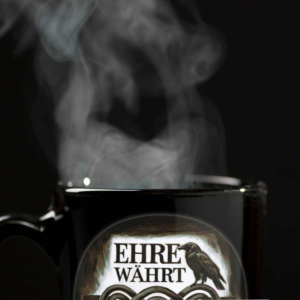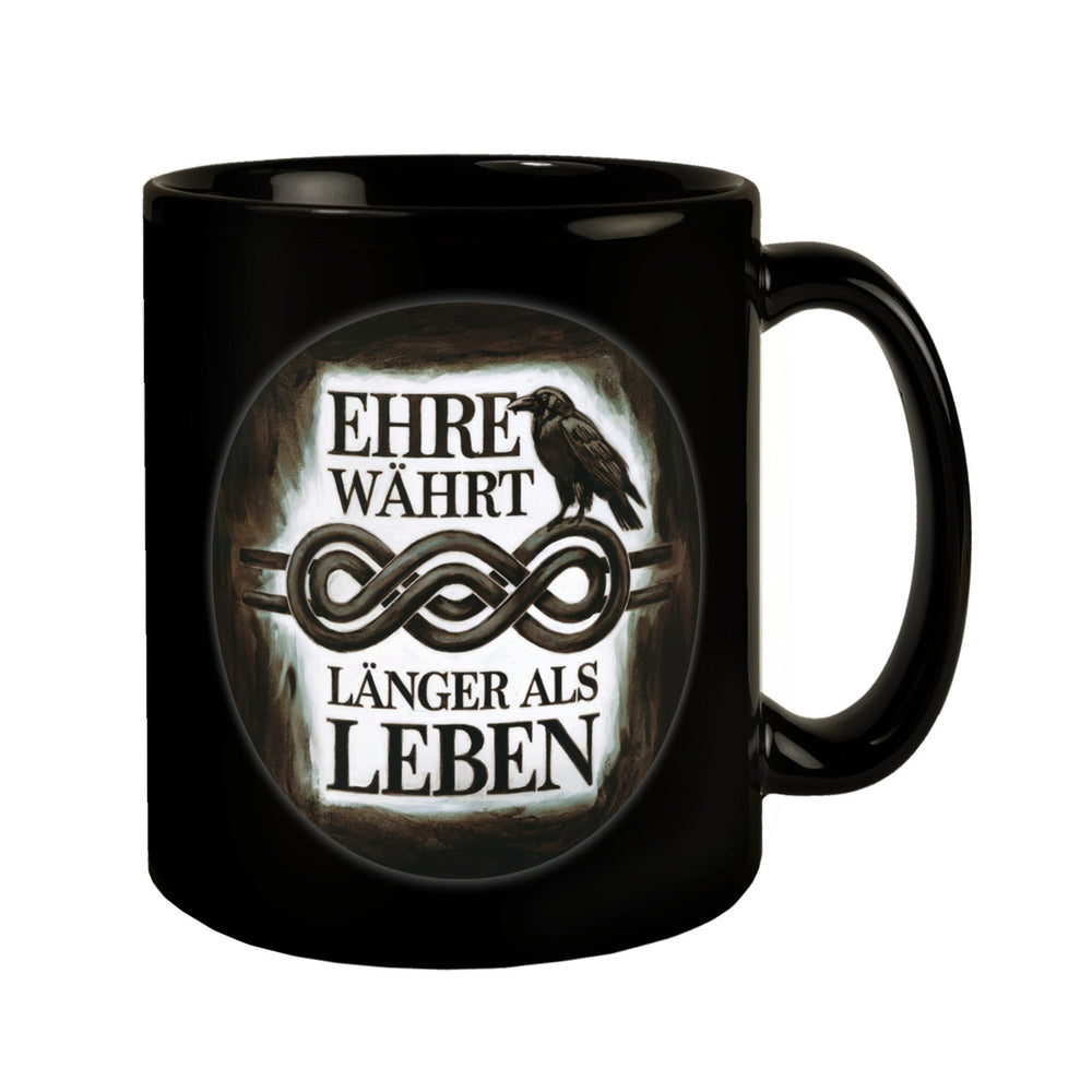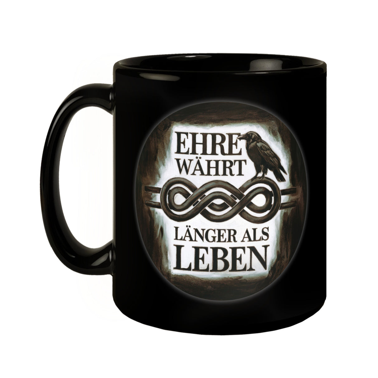 • Die Ewiger Knoten EHRE WÄHRT LÄNGER Tasse ist eine schwarze Keramiktasse mit einem beeindruckenden Aquarell-Pastellgemälde. Der ewige Knoten, begleitet von einem majestätischen Raben, ziert die Tasse. Darüber stehen kraftvolle Worte in Großbuchstaben: "EHRE WÄHRT LÄNGER ALS LEBEN" – ein absoluter Hingucker für jeden Schreibtisch.