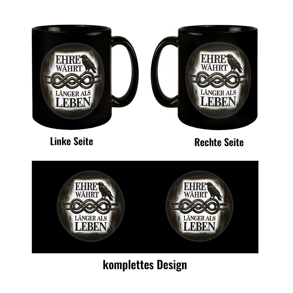 Die Ewiger Knoten EHRE WÄHRT LÄNGER Tasse ist eine schwarze Keramiktasse mit einem beeindruckenden Aquarell-Pastellgemälde. Der ewige Knoten, begleitet von einem majestätischen Raben, ziert die Tasse. Darüber stehen kraftvolle Worte in Großbuchstaben: &qu Hinweise: Fassungsvermögen: ca. 300ml