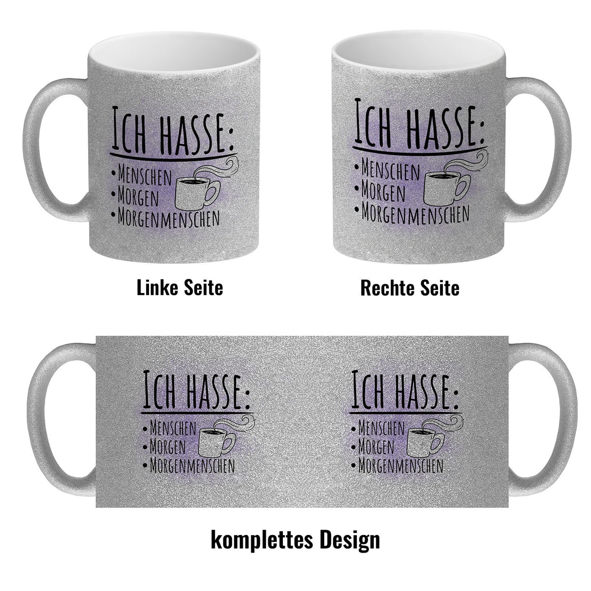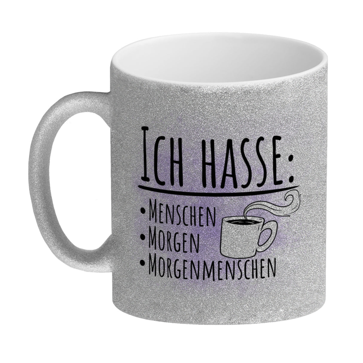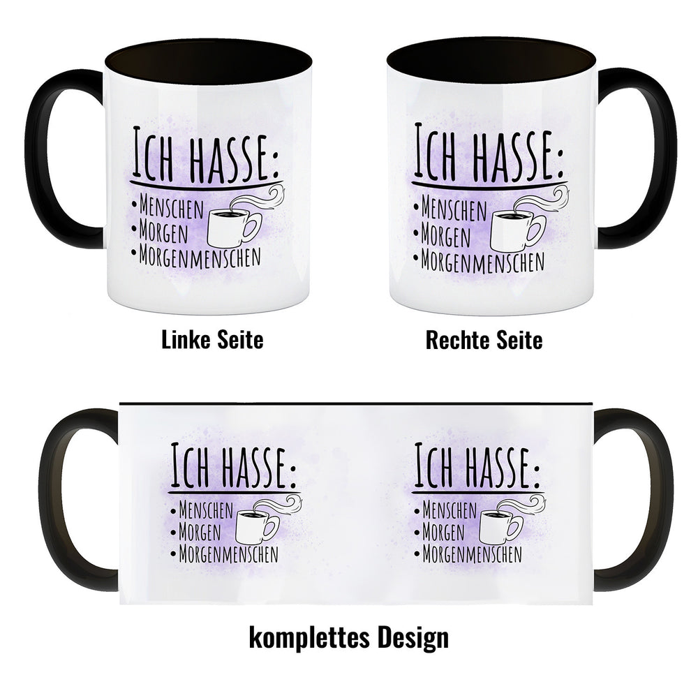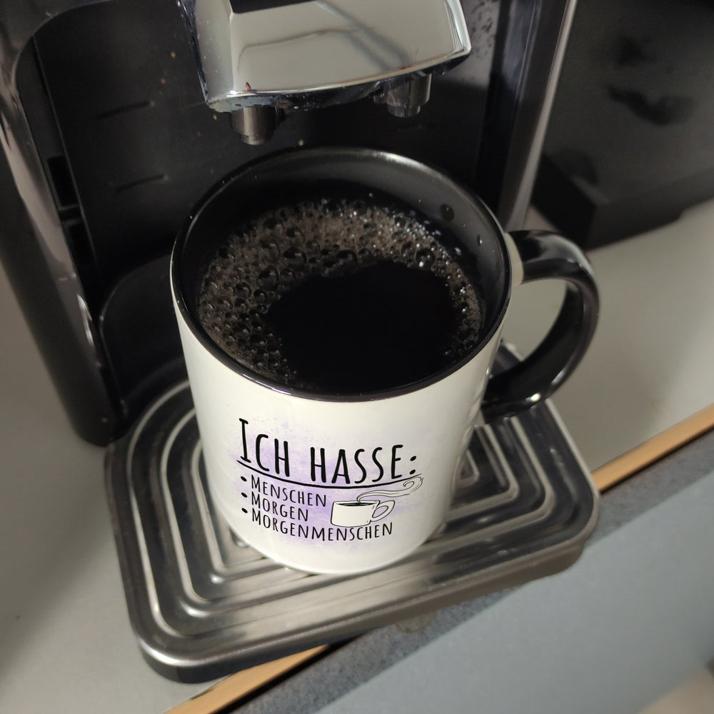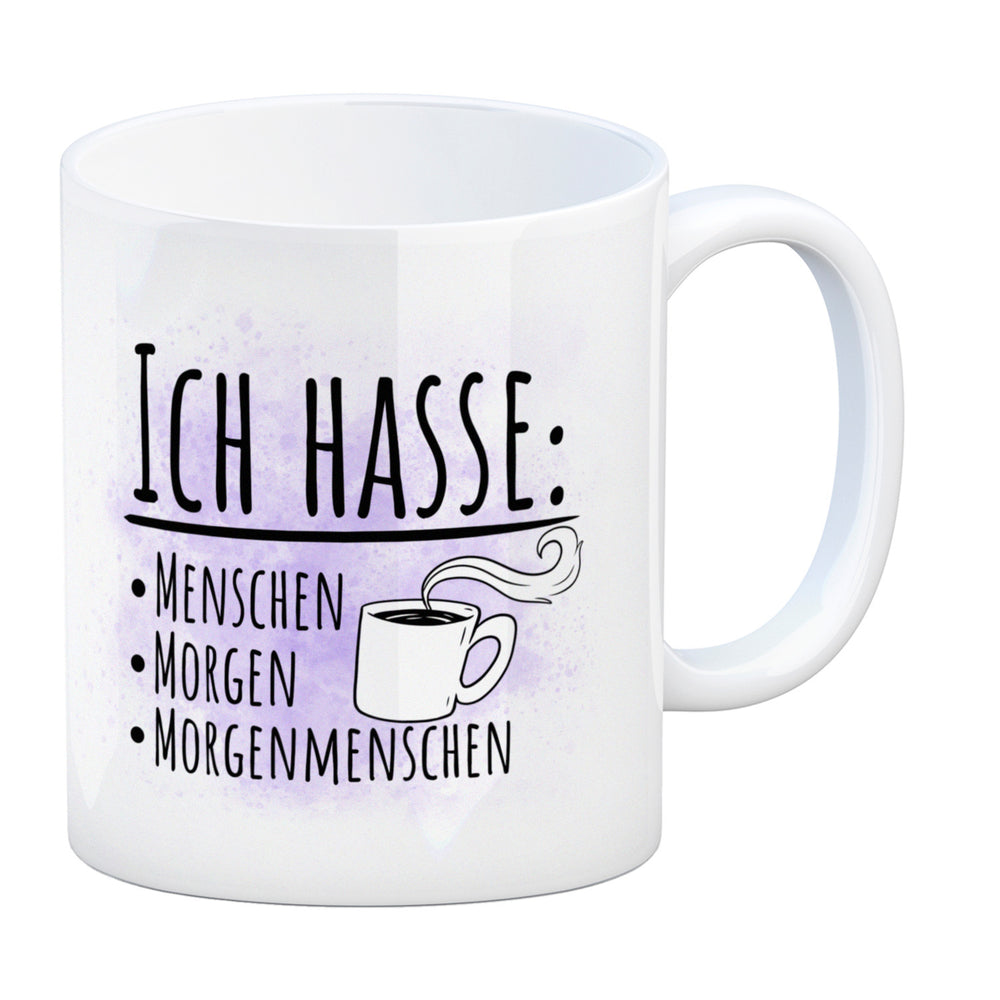 Zeige allen Morgenmuffeln, was du von ihnen hältst und hol dir den lustigen Ich hasse Menschen Morgen Morgenmenschen Kaffeebecher! Erhältlich in unterschiedlichen Varianten, zum Beispiel als weiße Standardtasse, mit farbigem Henkel und Innenseite oder als exklusive Silberedition. Alle Becher sind mit Sorgfalt in Handarbeit hergestellt und sind bestens für Kaffee und andere Heißgetränke geeignet. Mit diesem Becher wird jeder Morgen gleich viel erträglicher und du strahlst schon am frühen Morgen eine ganz klare Botschaft aus: Ich hasse Menschen, Morgen und vor allem Morgenmenschen!
