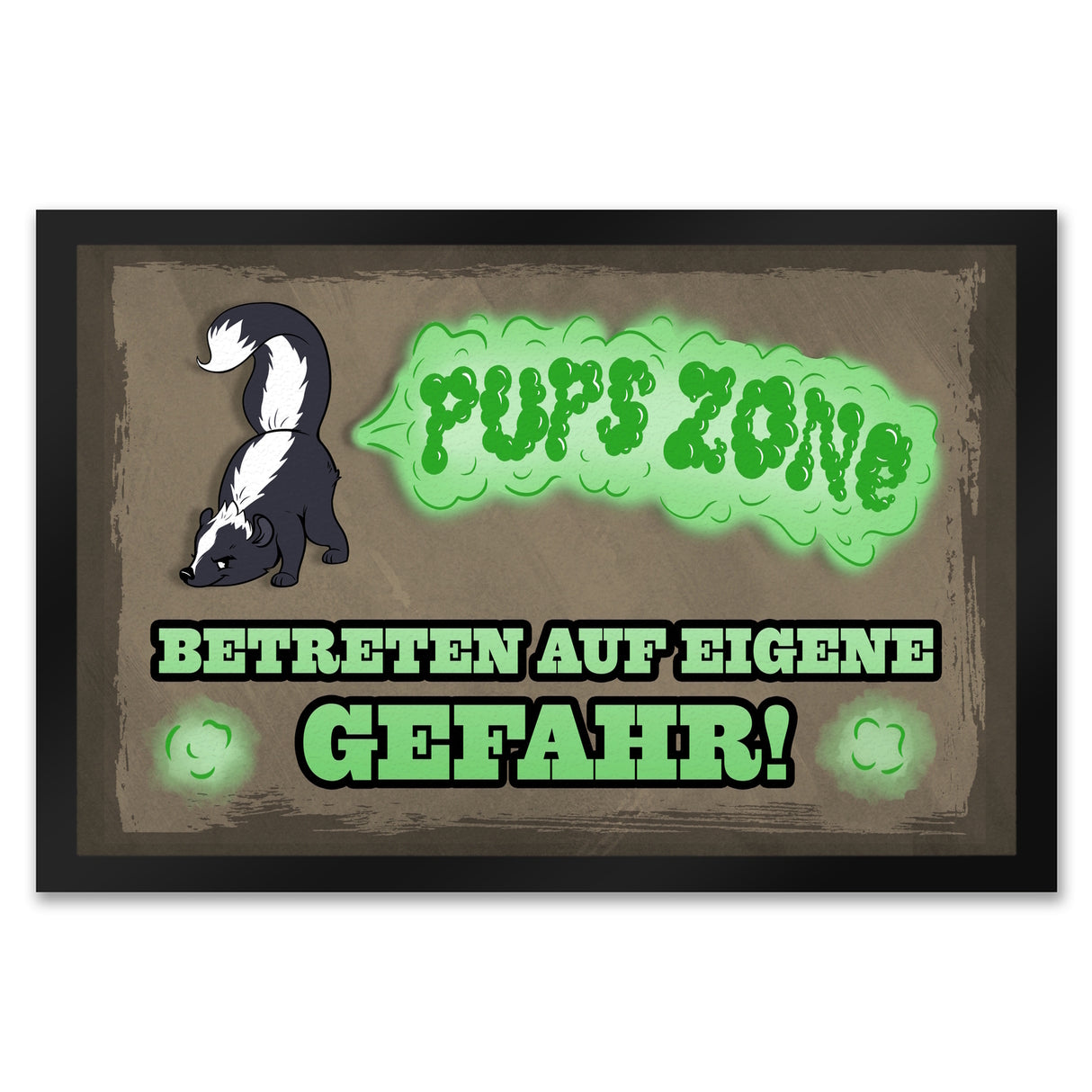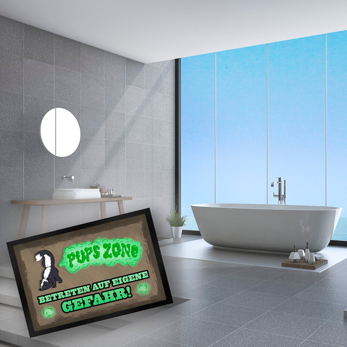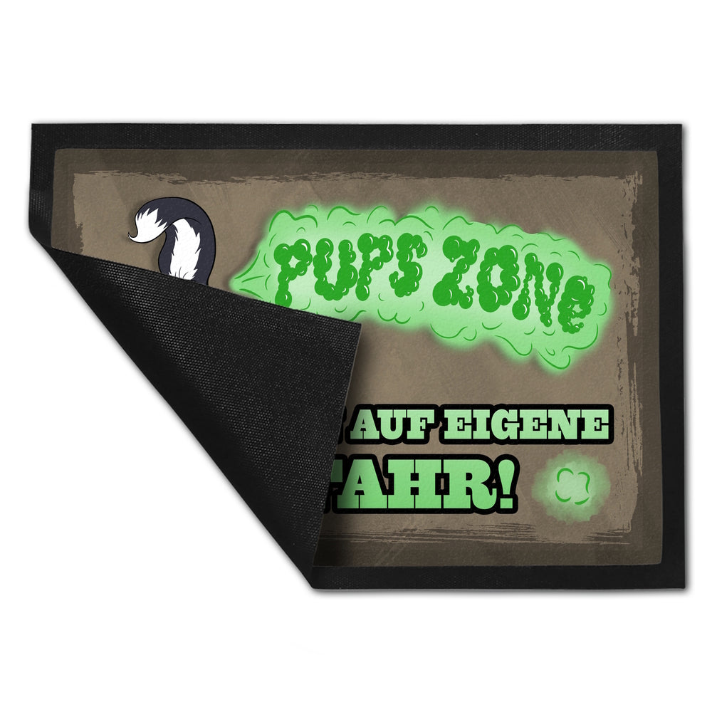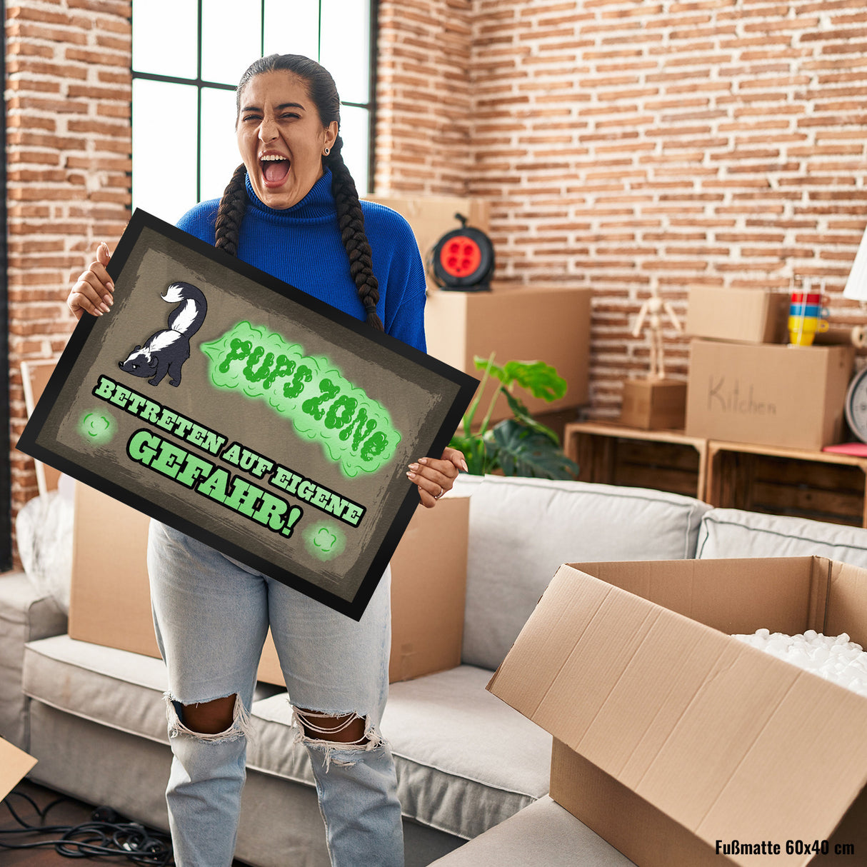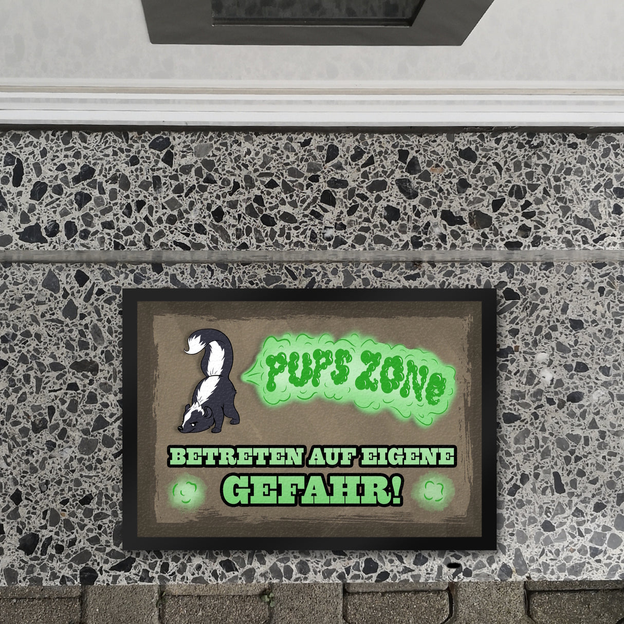 • 1x Pups Zone Betreten auf eigene Gefahr Fußmatte mit süßem Comic-Stinktier in der gewählten Größe