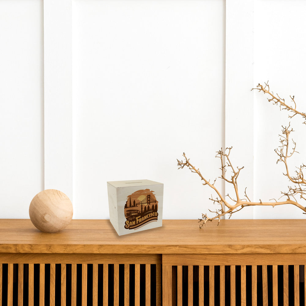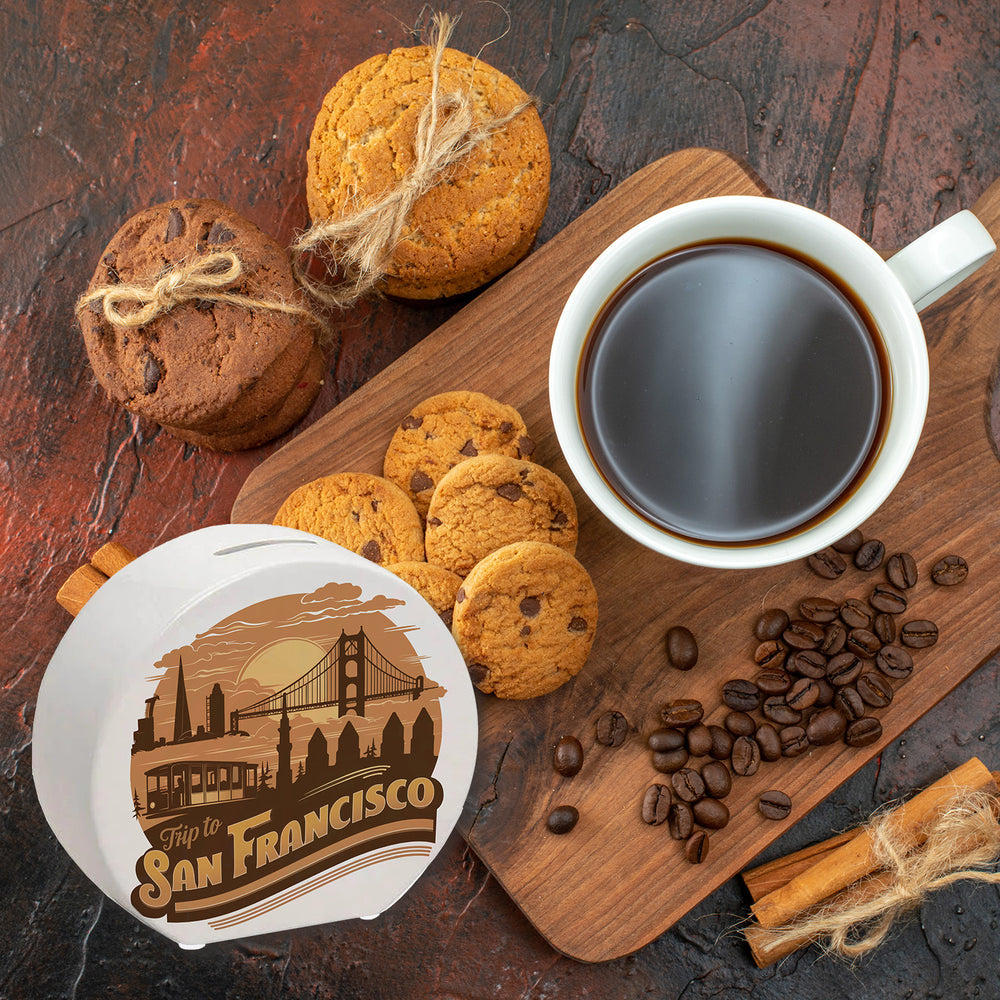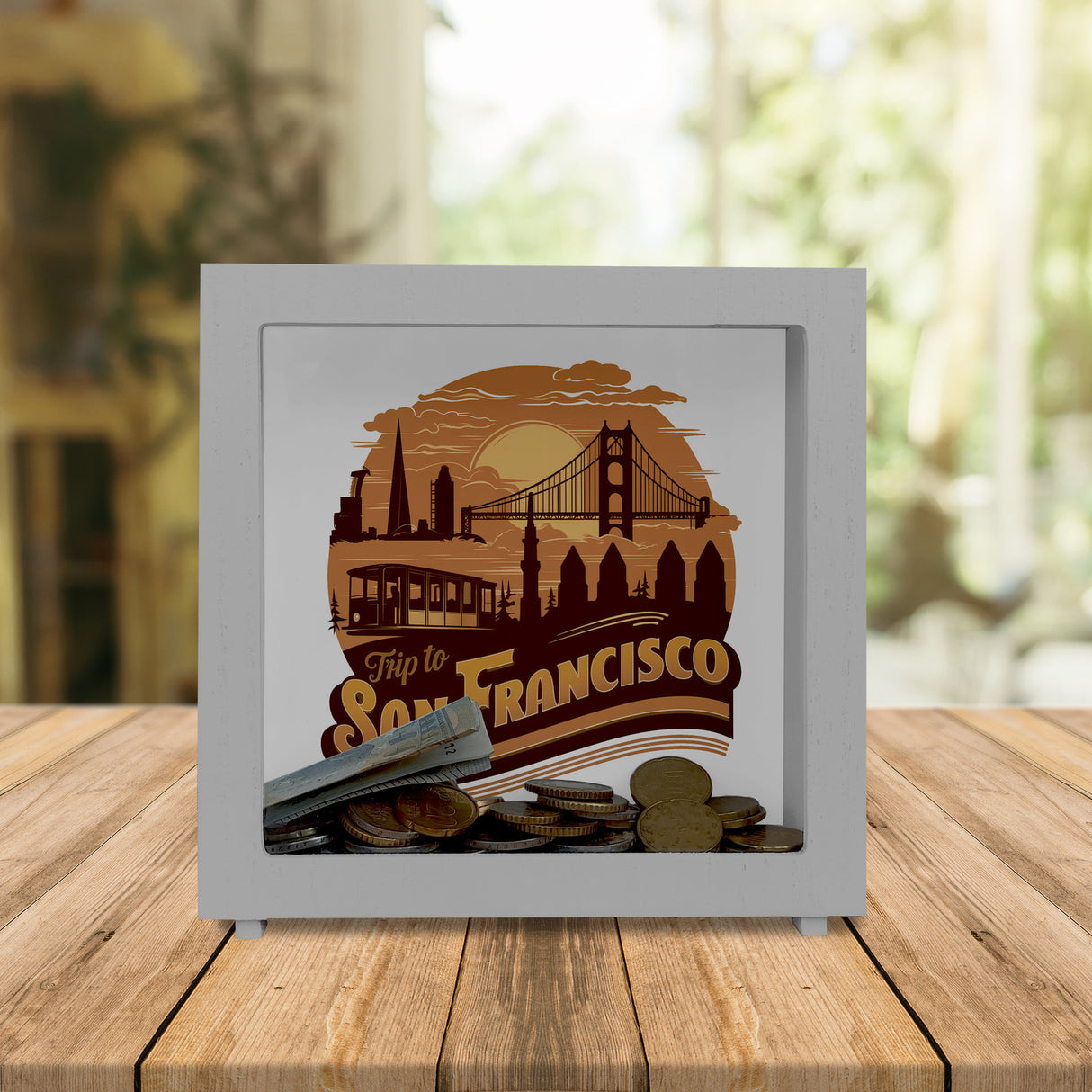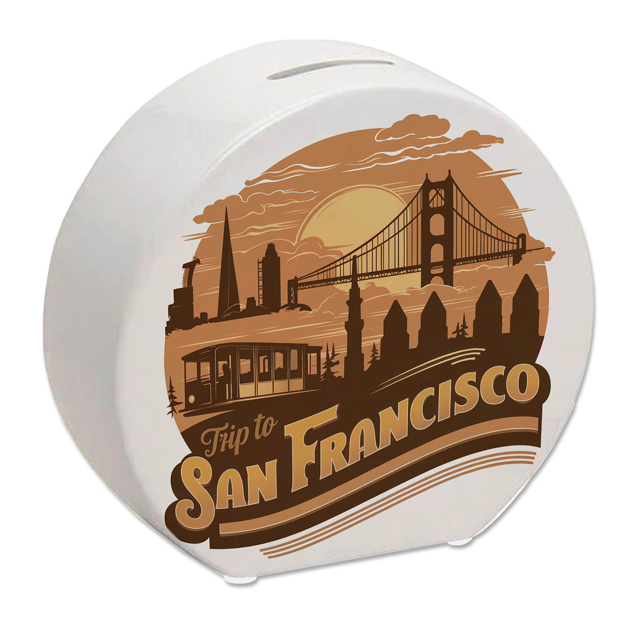 - Träumst du von der Stadt an der Bucht? Die San Francisco Trip Spardose bringt dir ein Stück vom Golden Gate direkt ins Wohnzimmer. Diese Retro-Spardose zeigt die faszinierende Stadtsilhouette von San Francisco – und das alles in einem charmant nostalgischen Design.