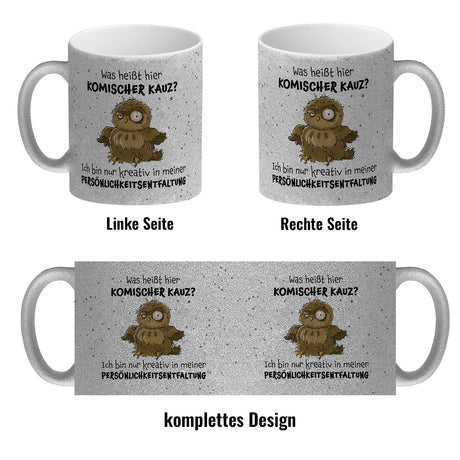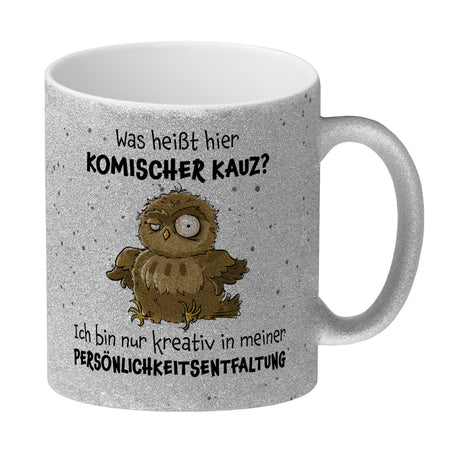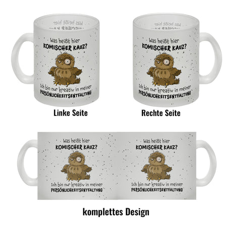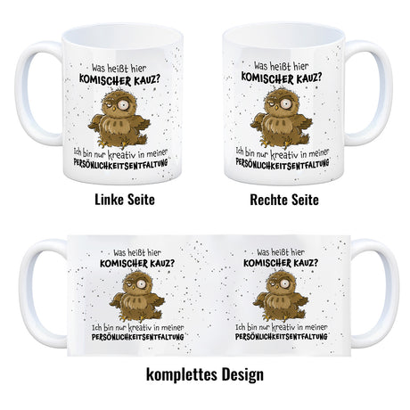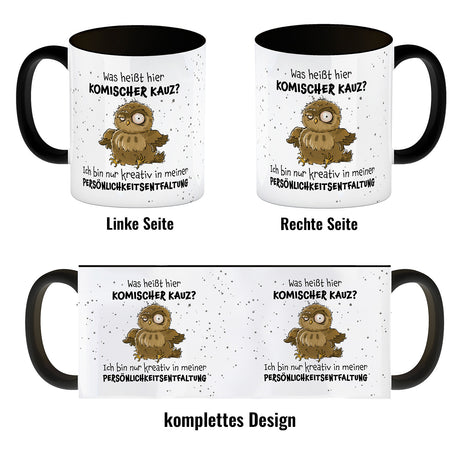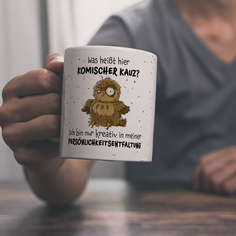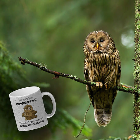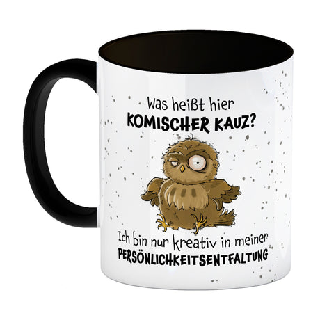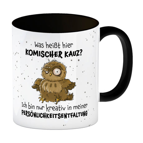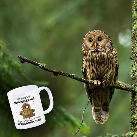 Eule Kaffeebecher mit Spruch Kreativ statt komischer Kauz