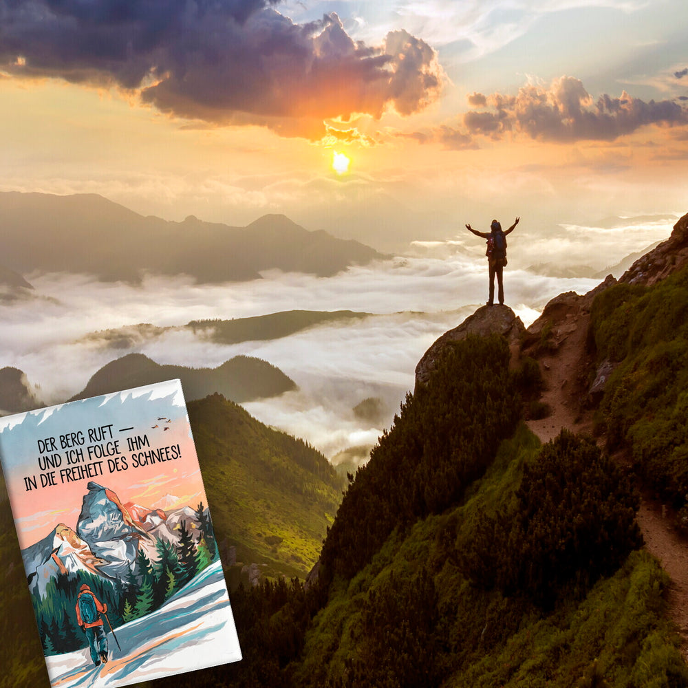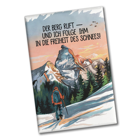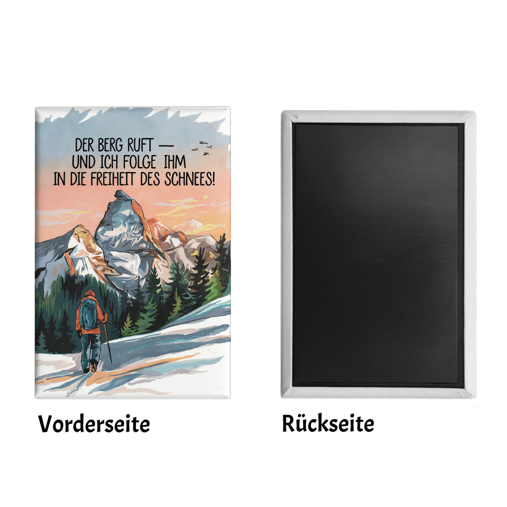- Der Magnet bringt die majestätische Schönheit der Berge direkt zu Ihnen nach Hause. Ein einsamer Wanderer mit Rucksack und Trekkingstöcken zieht gegen den felsigen Giganten und die von Vögeln bevölkerte, farbenfrohe Himmelsszenerie in den Bann. Die Nadelbäume flüstern leise im Wind, während der winterliche Spruch "Der Berg ruft -- und ich folge ihm in die Freiheit des Schnees!" das Abenteuer perfekt abrundet.