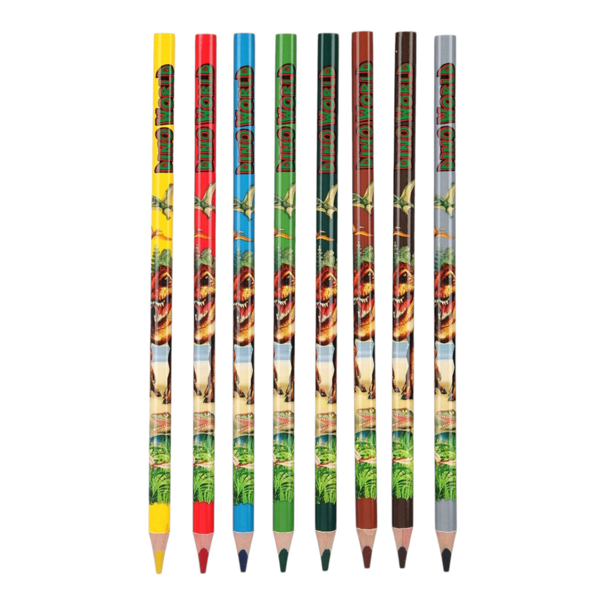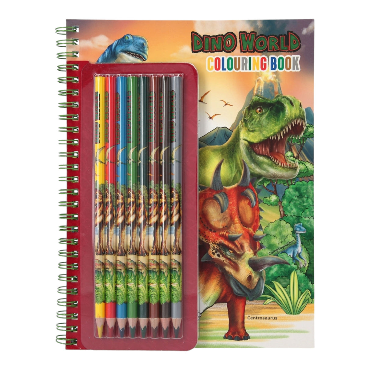 - 1x Dino World Dinosaurier Malbuch mit Buntstiften und Sticker bestehend aus 1x Malbuch, 8x Buntstifte und 1x Sticker.