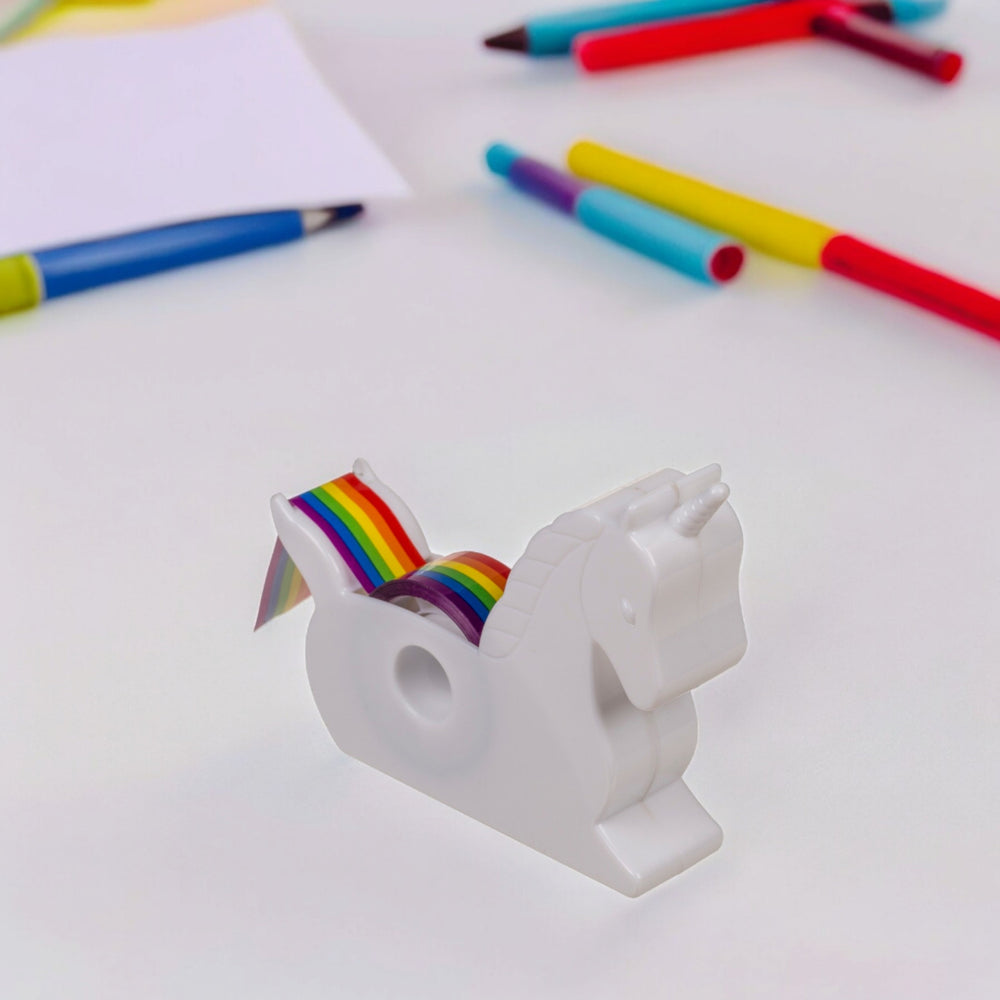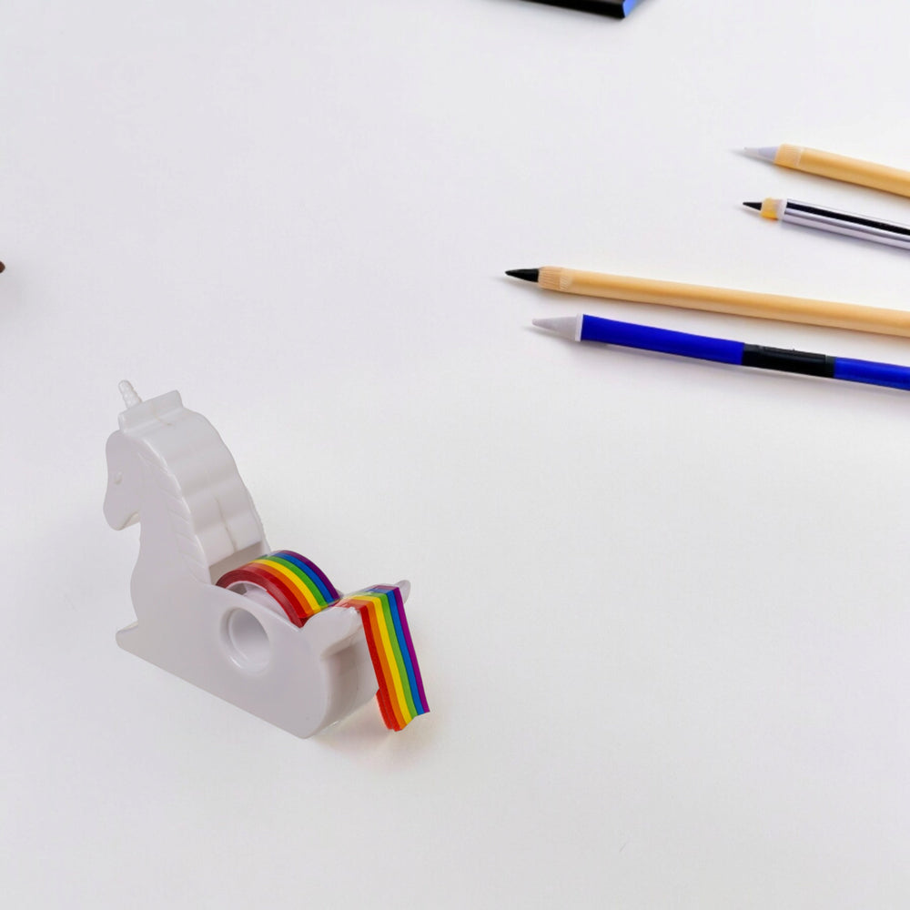 - Der Einhorn Klebebandabroller entführt dich ins Land der Fantasie: Ein stolzes Einhorn, das Regenbogen-Klebeband spendet! Einfach dein Band auf das mythische Wesen rollen, und mit dem schicken Trimmer am Einhorn-Popo schnippst du dir Stück für Stück Büro-Freude ab.