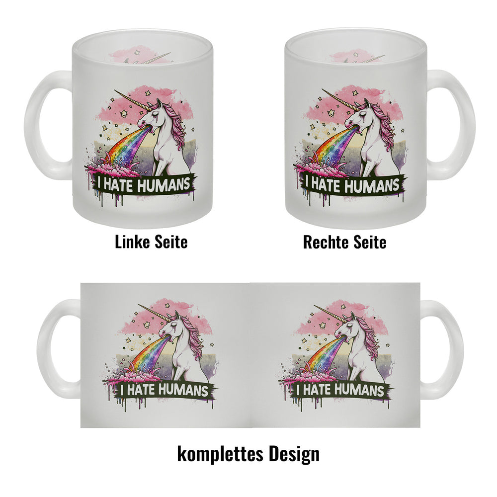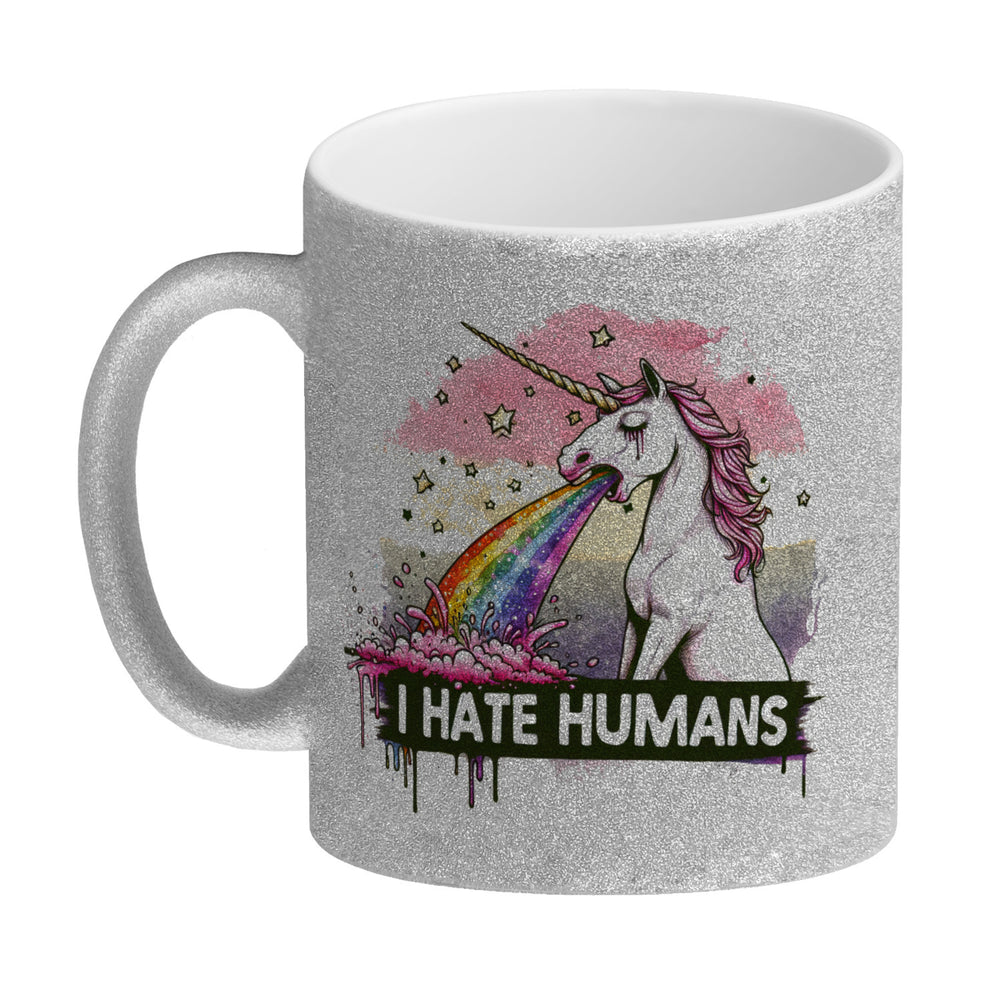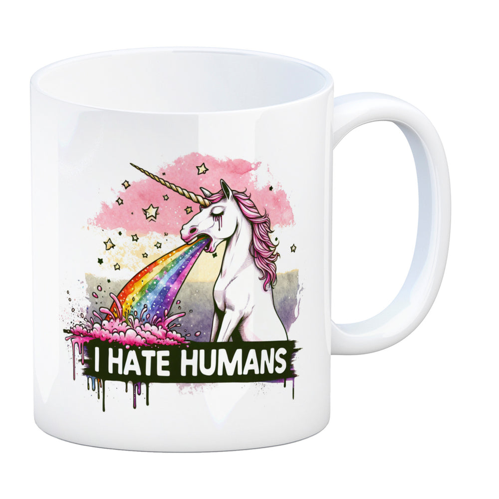 • 1x Einhorn kotzt Regenbogen Kaffeebecher mit Spruch I hate Humans in der gewählten Ausführung