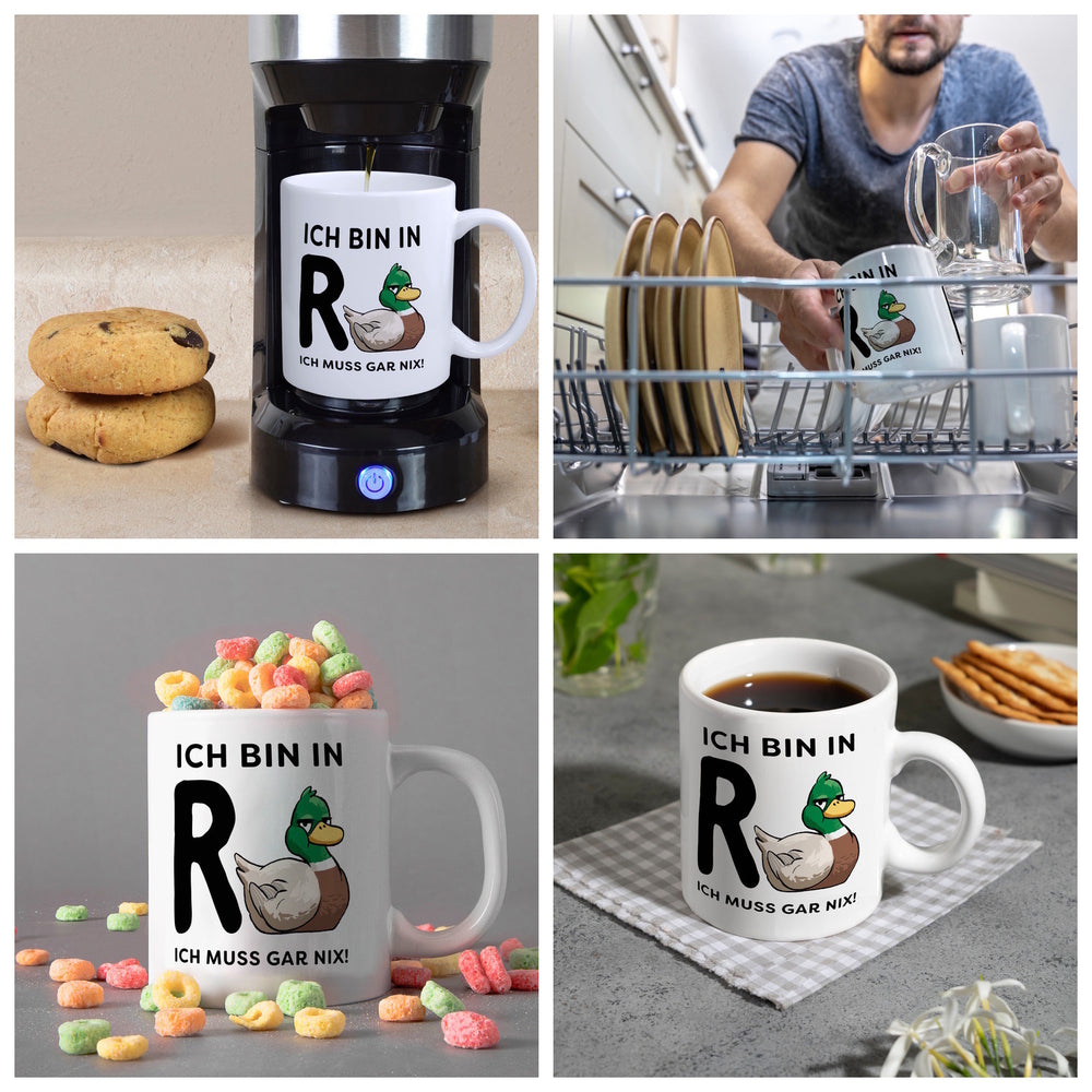 Ente Ruhestand Kaffeebecher mit Spruch Ich bin in R-Ente Ich muss gar nix