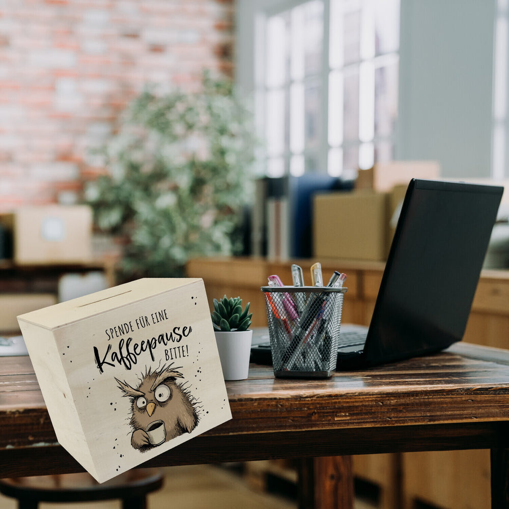 - Verliebt in Kaffee und verrückte Eulen? Unsere Eule Spardose mit dem Spruch „Spende für eine Kaffeepause. Bitte!“ ist genau das, was du brauchst! Diese lustige Spardose im Cartoon-Stil ist ein echter Hingucker und bringt Freude an jeden Arbeitsplatz!