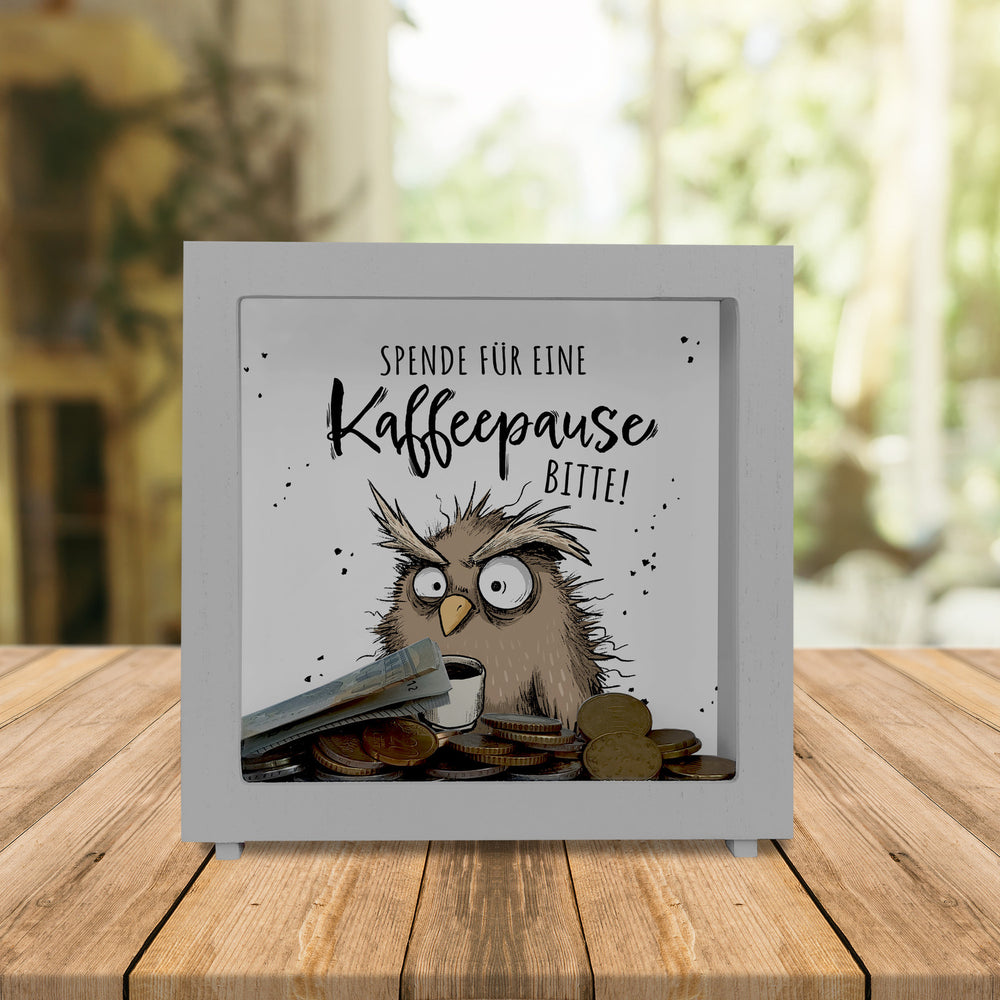 Eule Spardose mit Spruch Spende für eine Kaffeepause