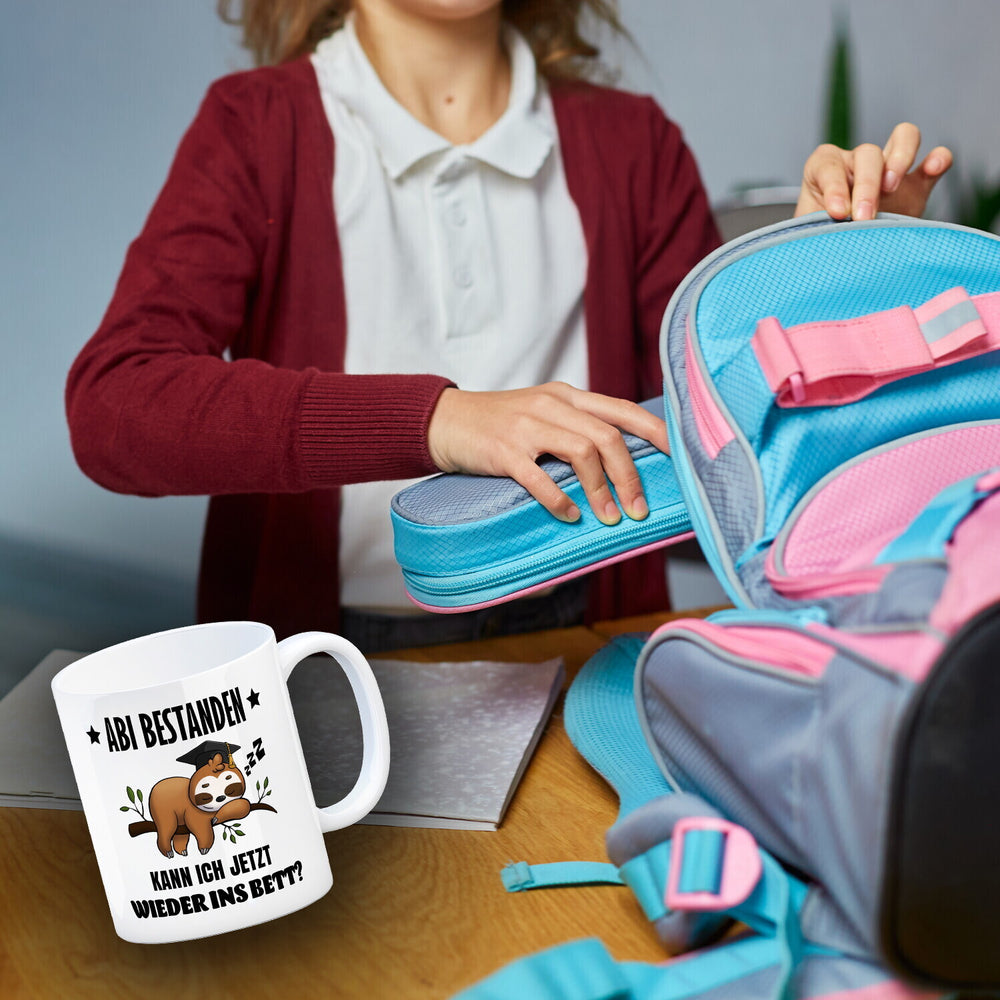 Faultier Abitur Kaffeebecher mit Spruch Abi geschafft zurück ins Bett