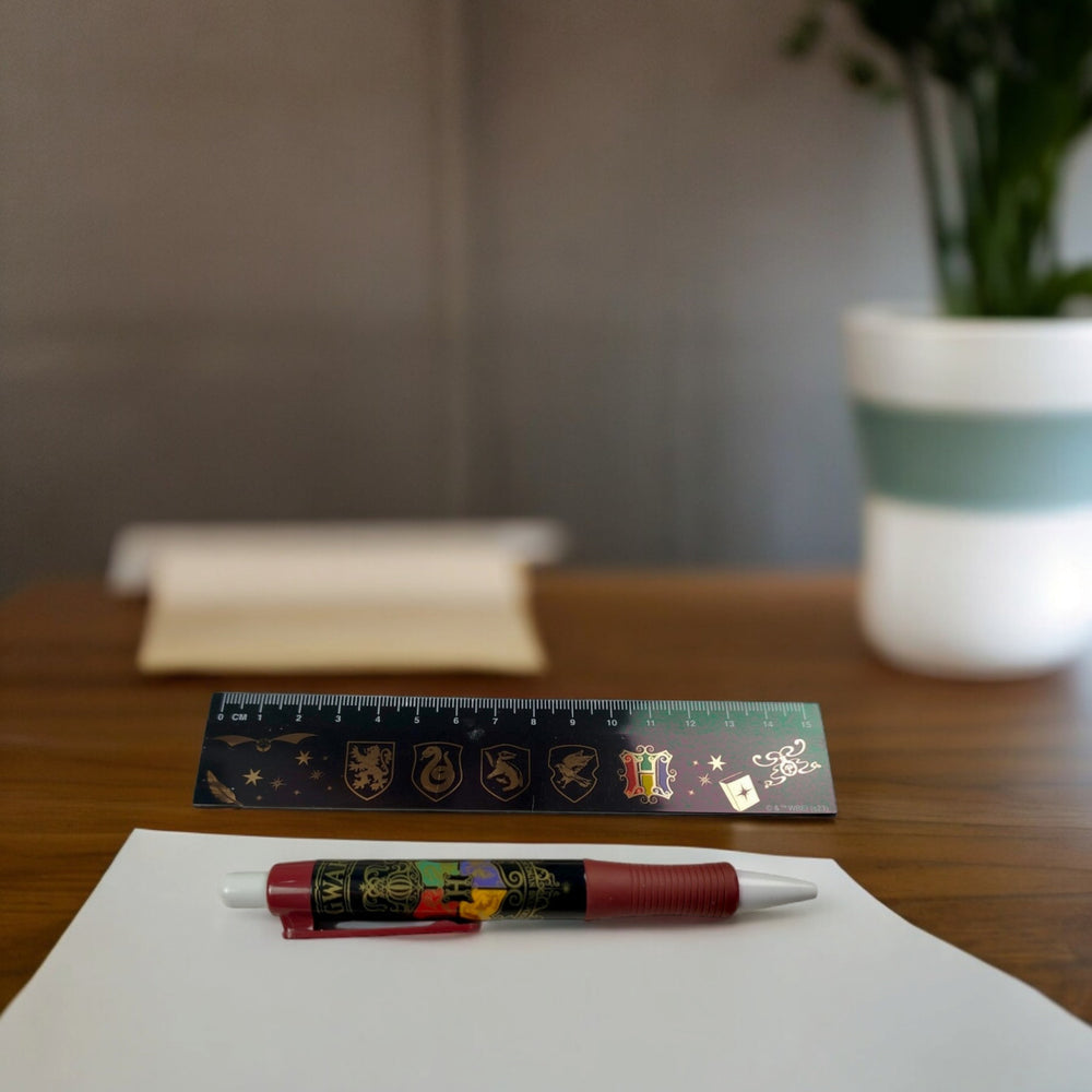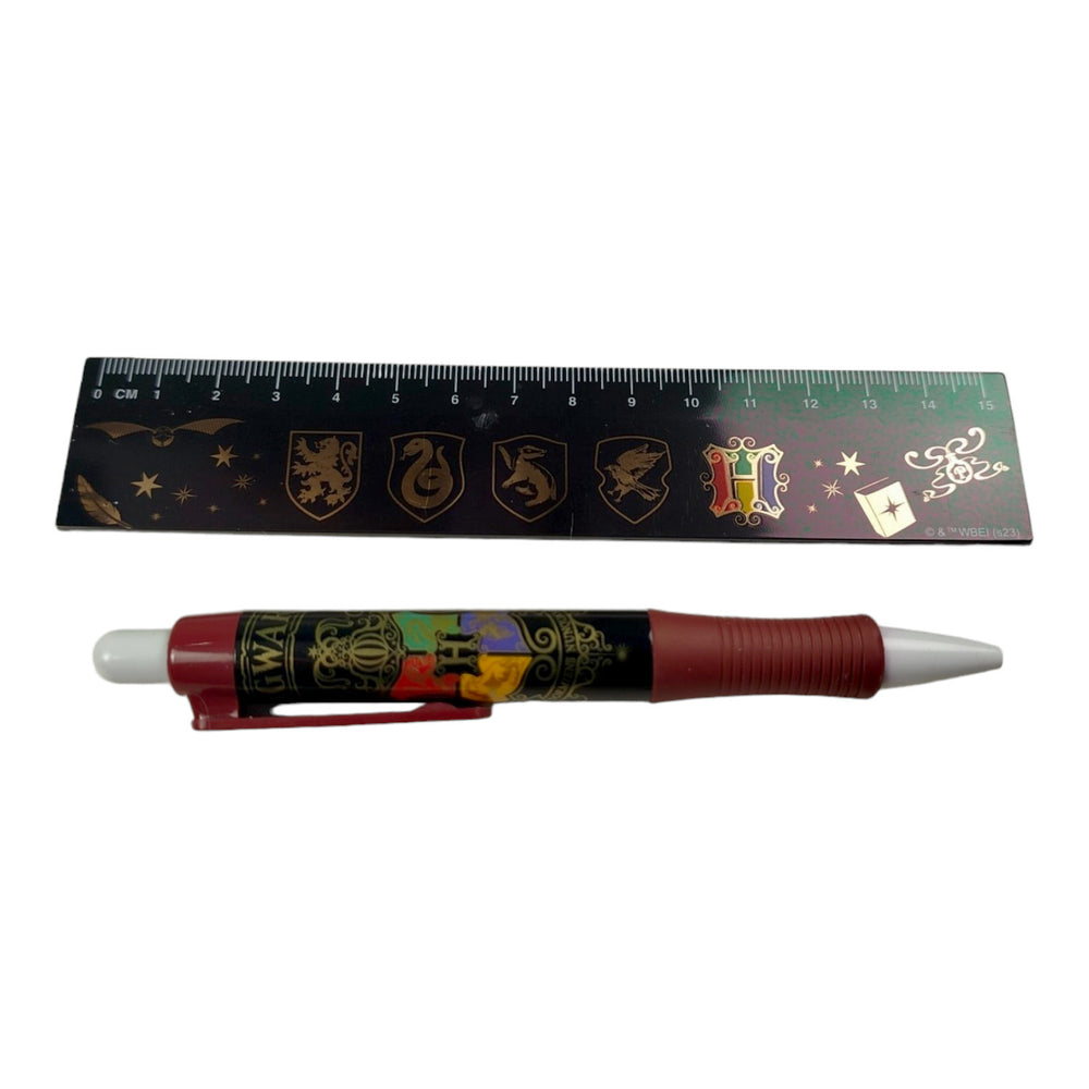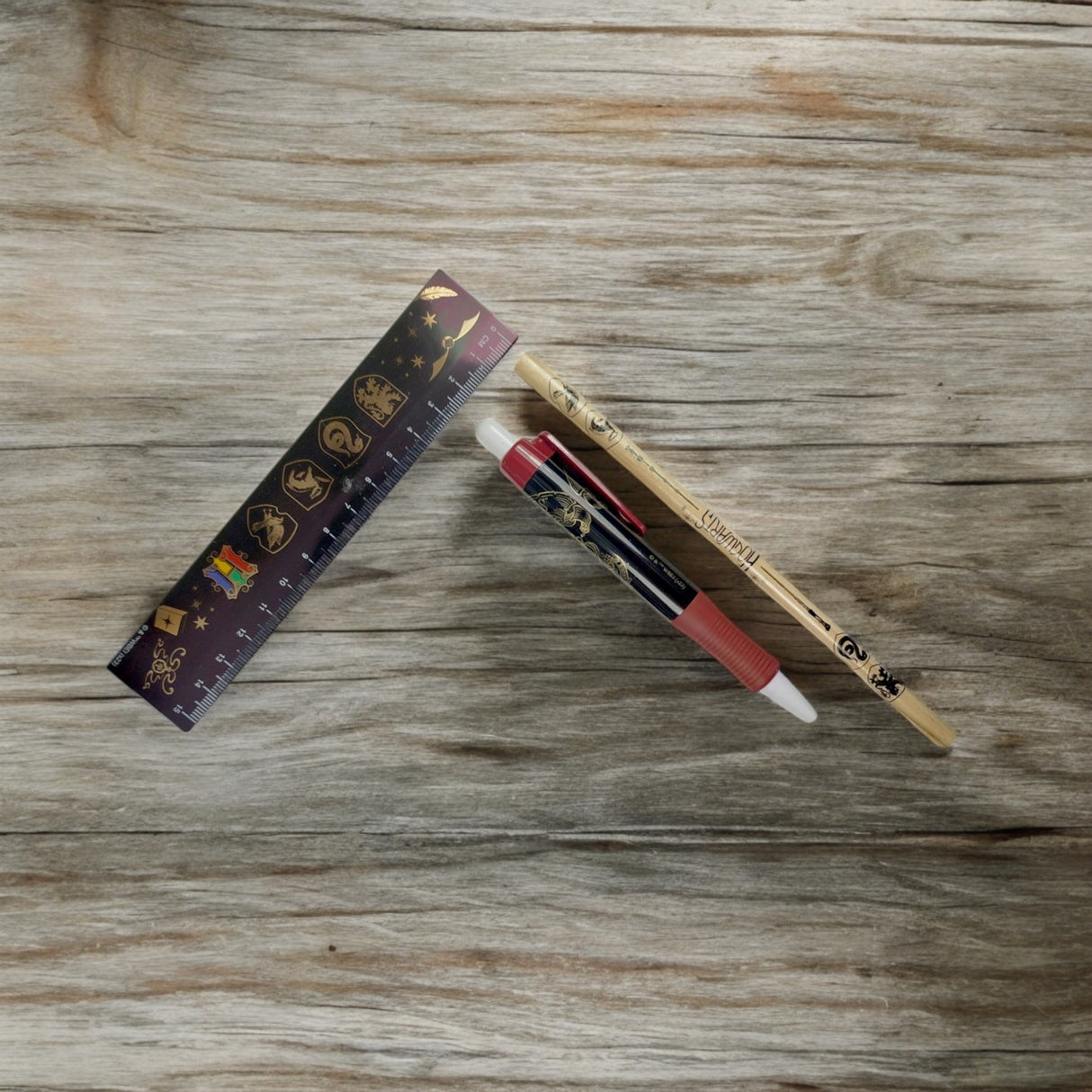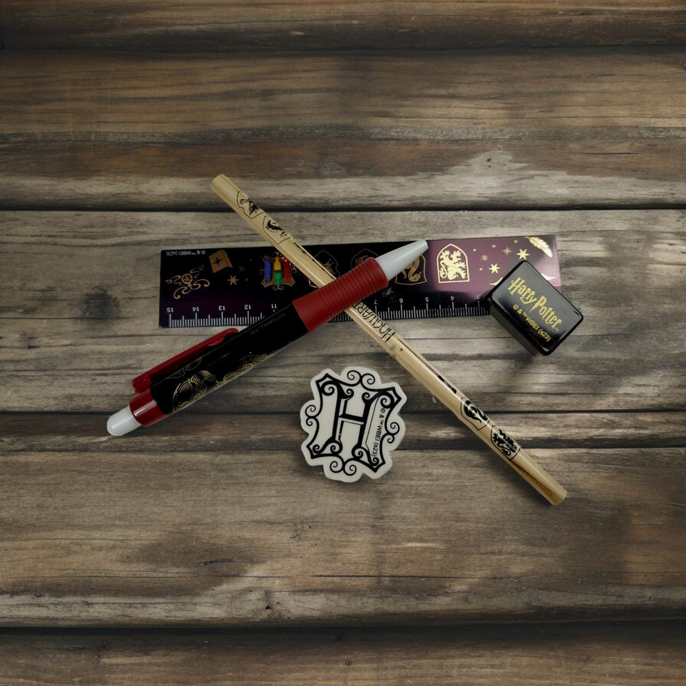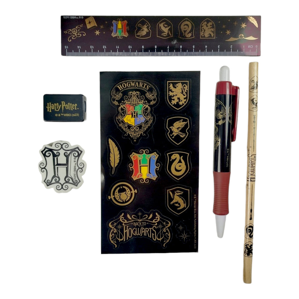 1x Harry Potter Hogwarts Schreibset für die Schule. Bestehend aus 1x Lineal, 1x Rdiergummi, 1x Anspitzer, 1x Kugelschreiber, 1x Bleistift und 1x Sticker.
